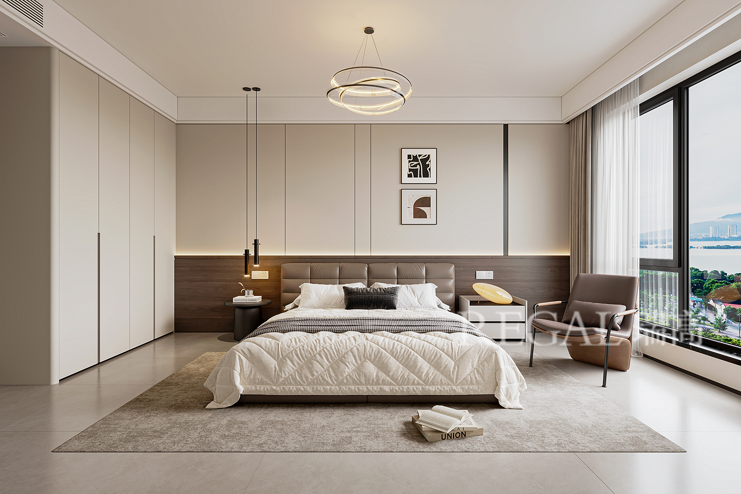 采光与视野:超大落地窗 + 柔纱帘,既引入充足自然采光,又柔化光线;同时能直接俯瞰城市景观,提升空间氛围感。