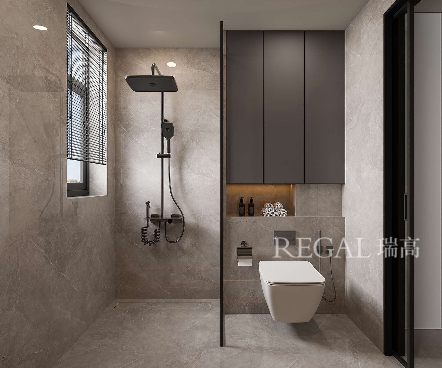 本案设计注重空间层次感与色彩对比,通过简约硬装与精致软装打造高级感。色调上以黑白灰为主,点缀色彩艳丽的艺术画作,和黑色木饰面形成强烈对比,增强空间层次。同时通过米灰柔光地砖、白色柜体等元素平衡视觉,避免压抑感。