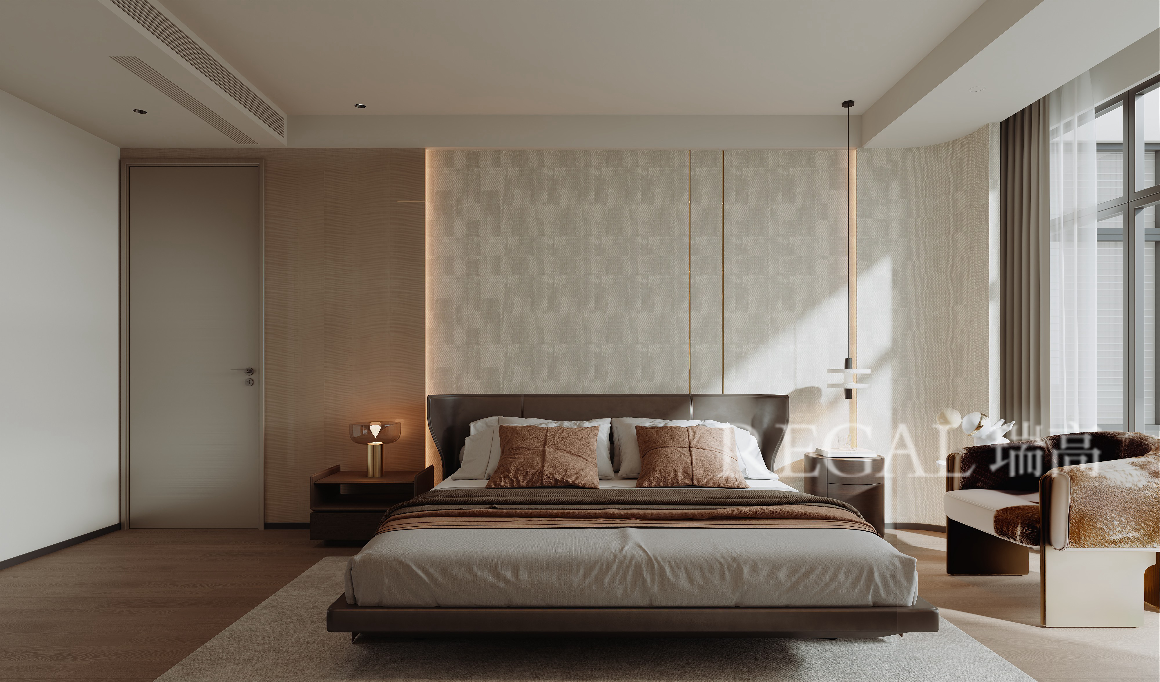 软装色彩协调统一,营造成熟优雅氛围,满足居住者睡眠需求。在现代轻奢美学框架下,使空间从“功能分割小房间”变为“舒展复合生活场景”,契合都市人群“精致居住”审美和“弹性功能与舒适尺度”实用要求。
