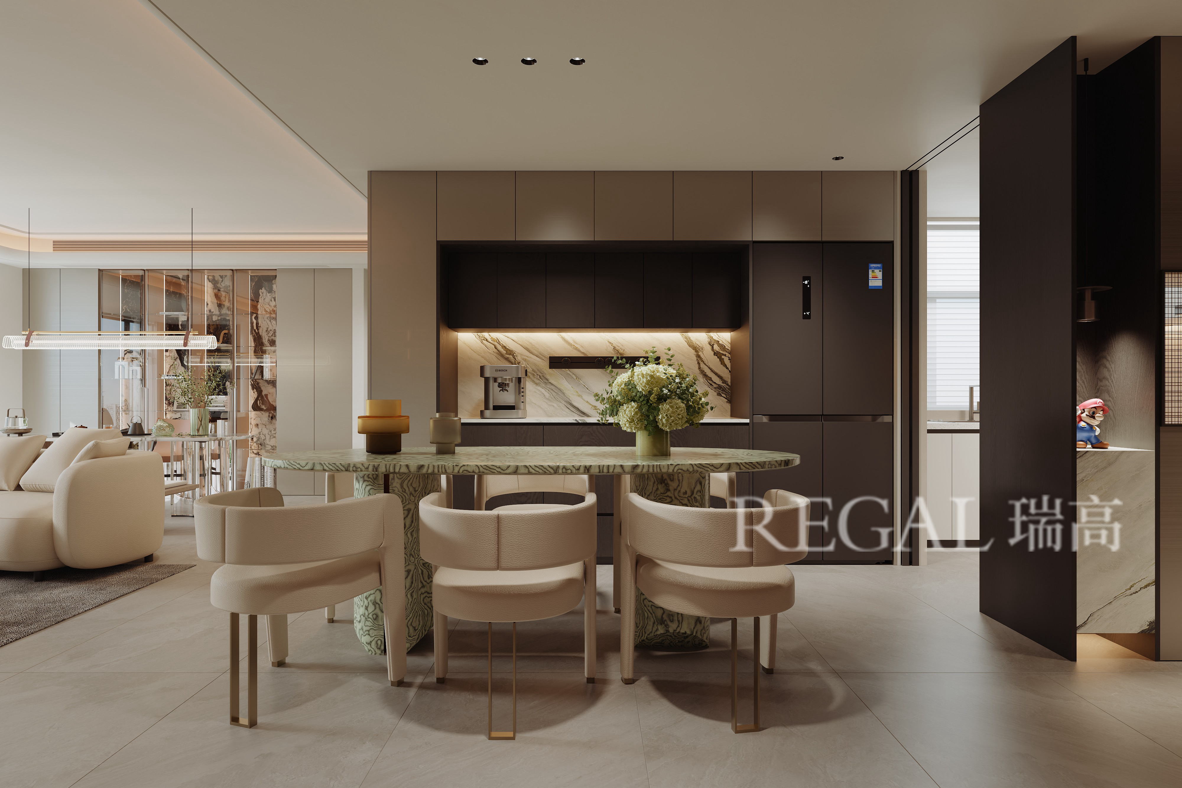 意式轻奢的灵魂在于「克制的张扬」,当融入温润木色后,更演变为一曲理性与温度的协奏。它以极简的线条和中性色调为骨架,再以烟熏橡木的深邃、胡桃木的纹理、或是白蜡木的清浅作为空间的情感纽带——木色的暖与岩板的冷、金属的利落、皮革的柔软形成微妙对抗,在秩序井然的几何构图里注入自然呼吸感。