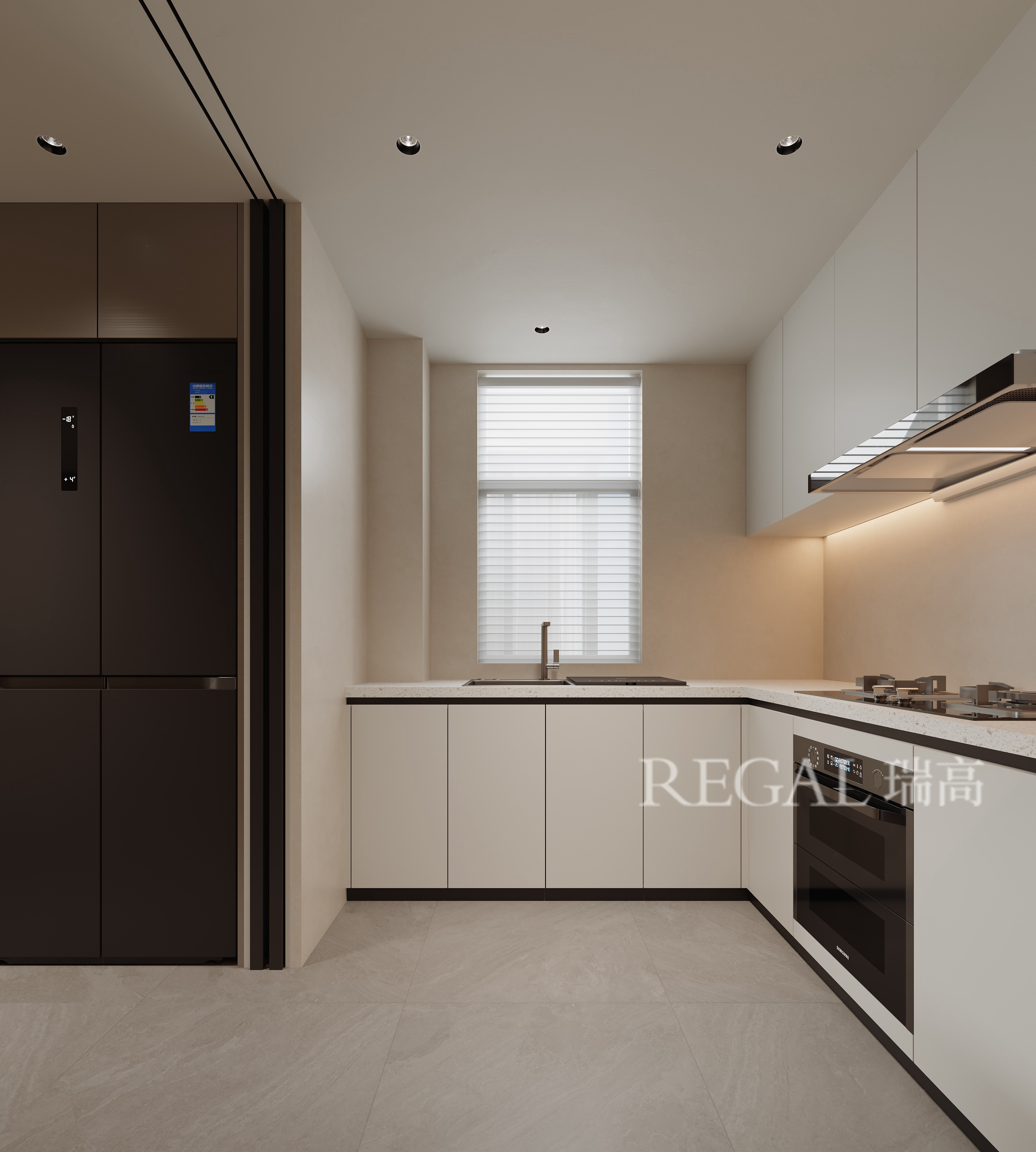 采用 L 型台面布局,墙面是浅米色,橱柜以浅白色为主并搭配黑色线条点缀,地面是浅灰色大理石纹理瓷砖,视觉上干净清爽。