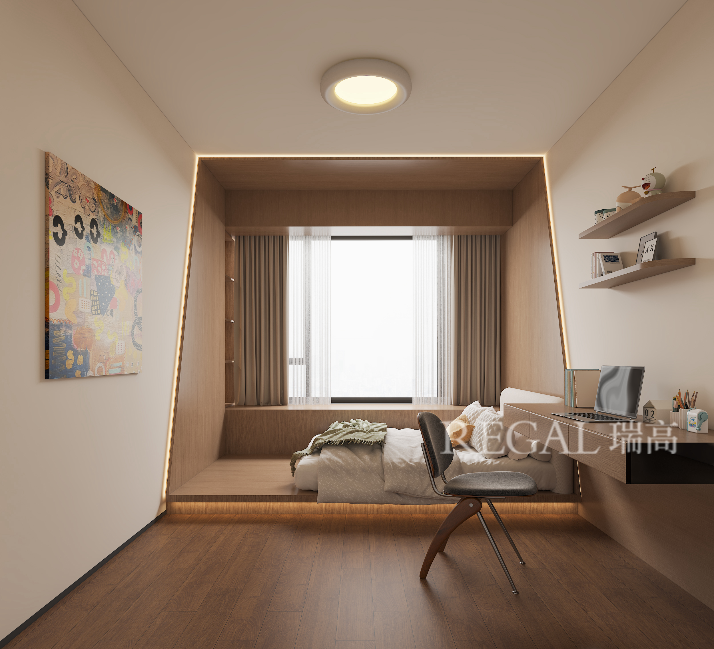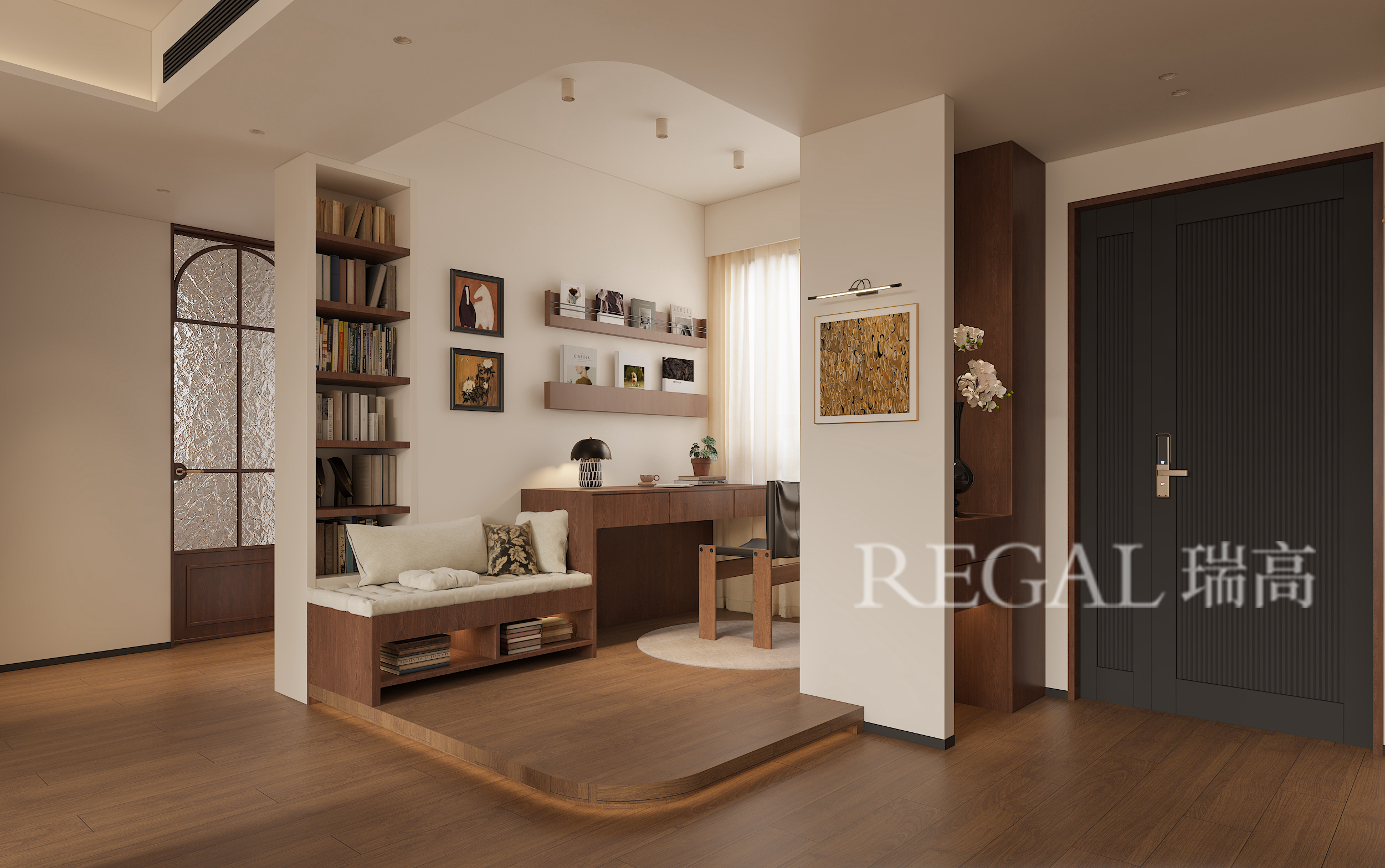 书房的设计中,我们选择了推拉门的形式,即能使空间更为通透,又能使空间形成整体的互动。