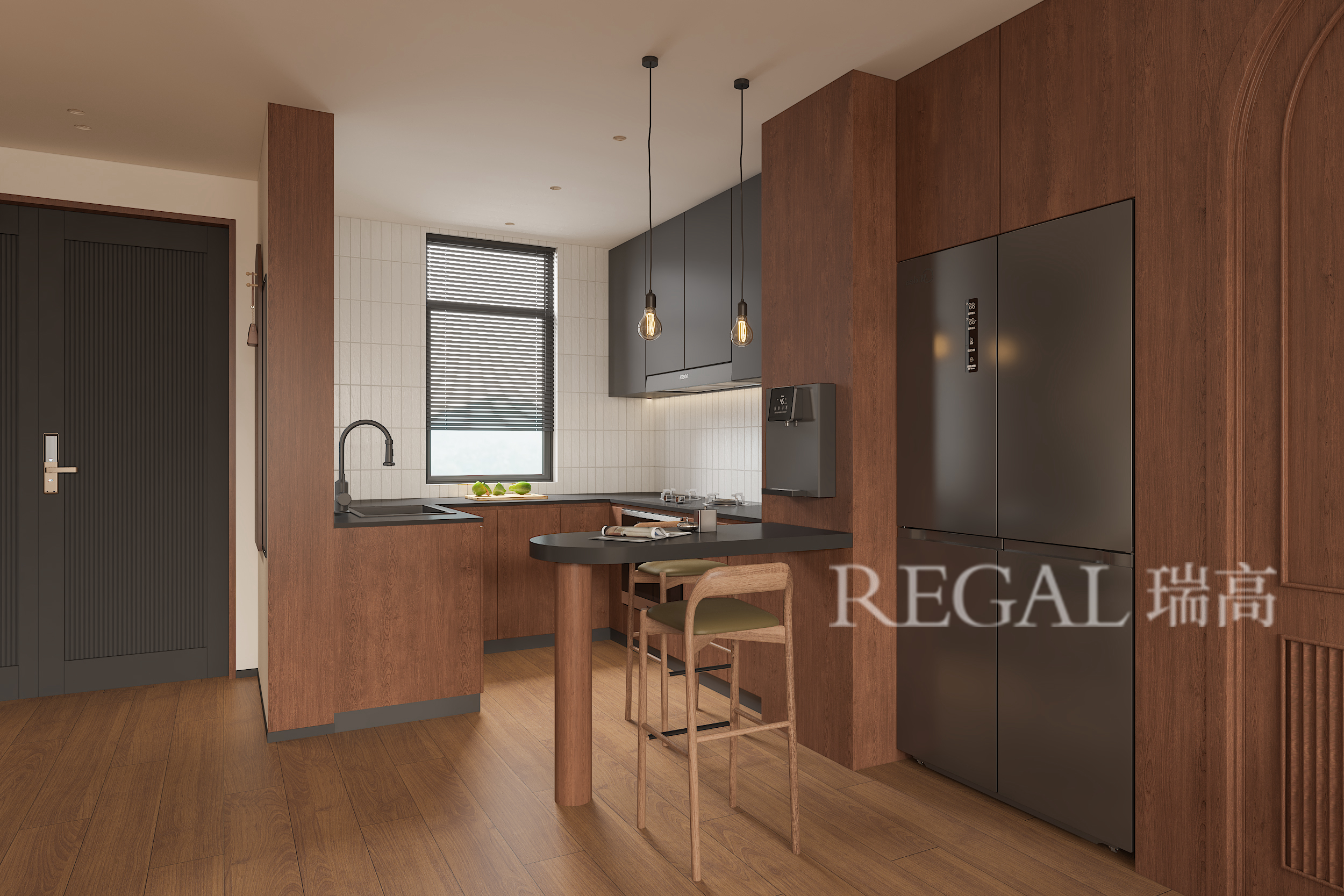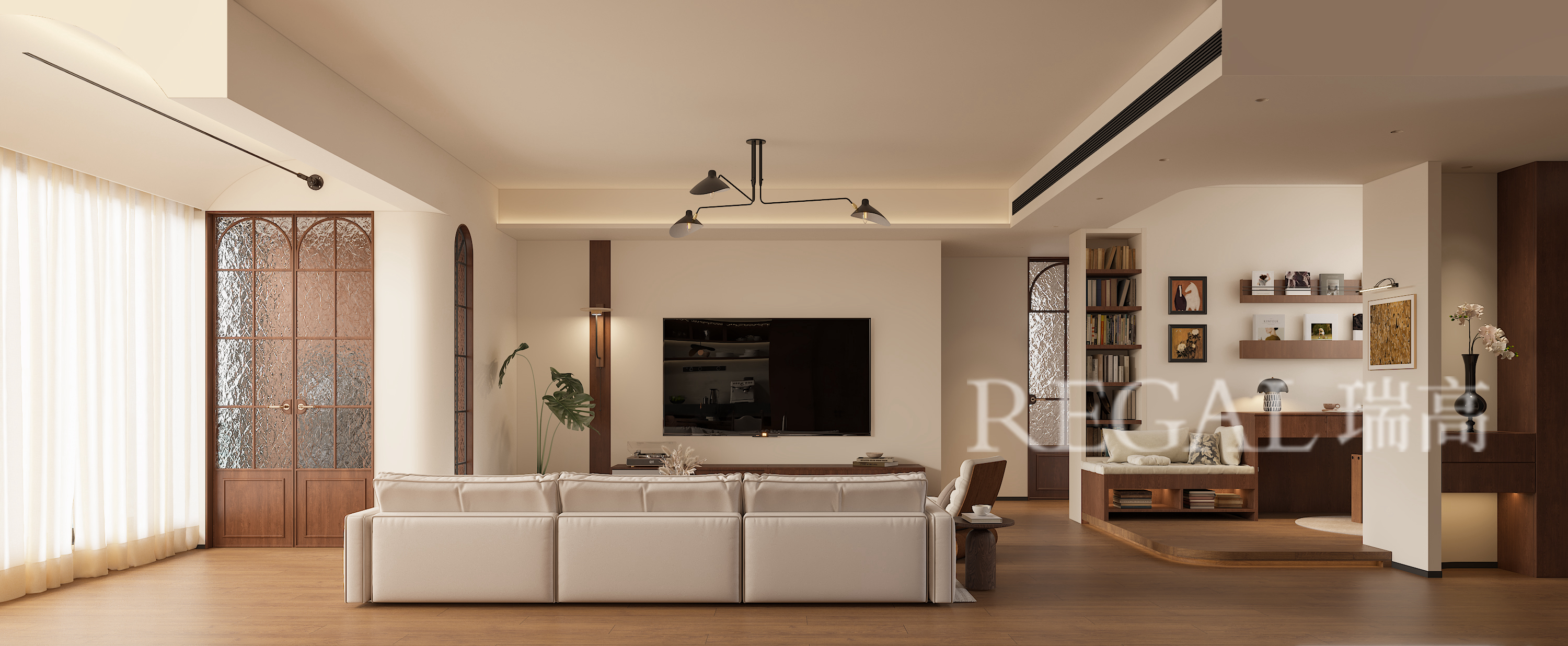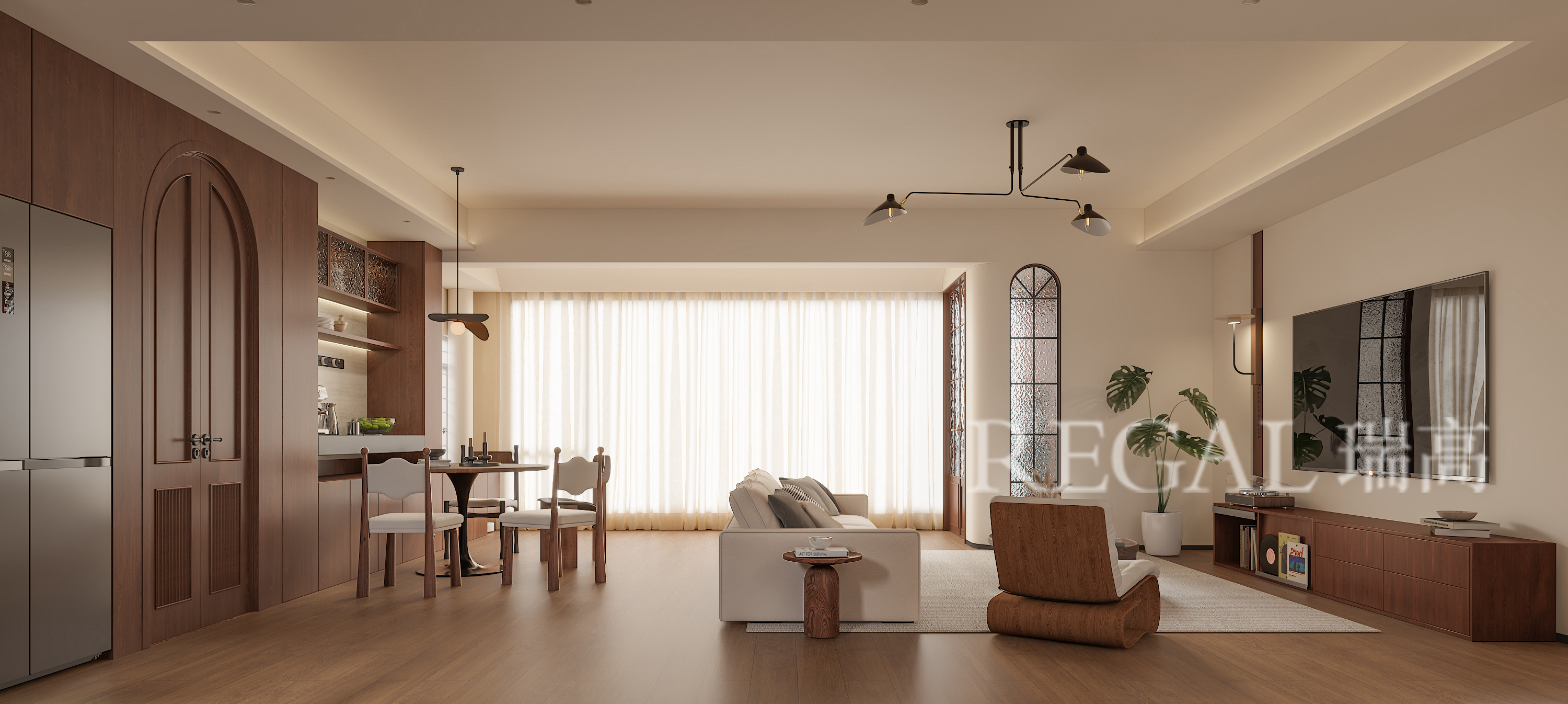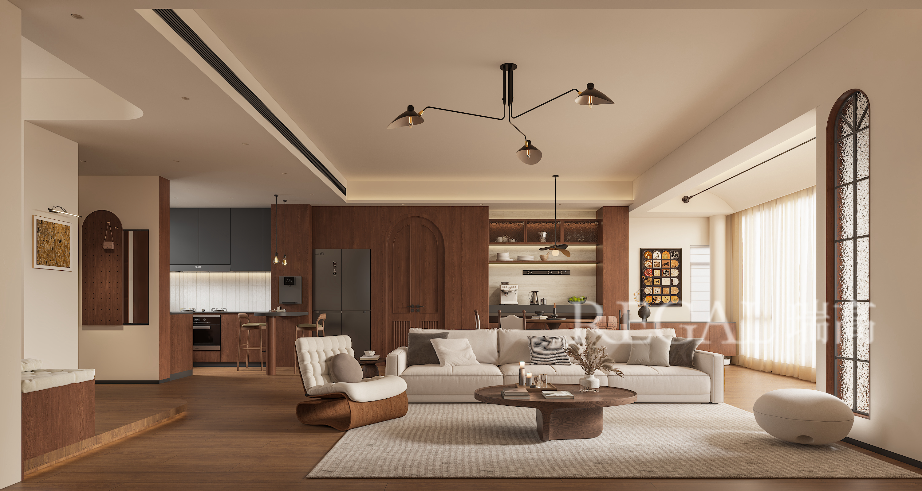 本案就采用了客餐厨一体化家居空间,整体设计既通透又有质感:风格与色调表现上主打温暖的「现代轻复古」,以胡桃木色木纹、柔和米色为基底,搭配深灰厨房柜体做层次,氛围温馨又高级。