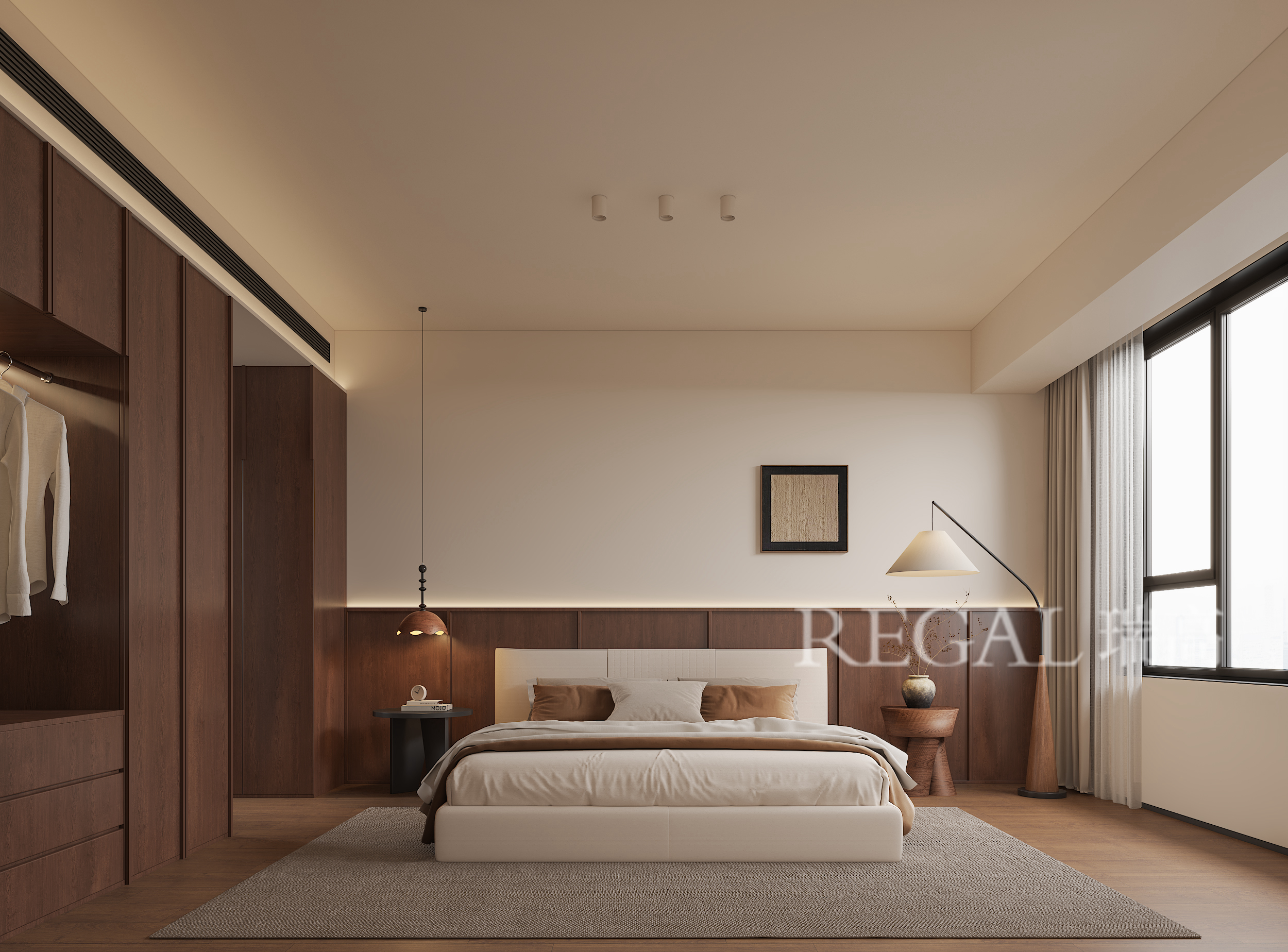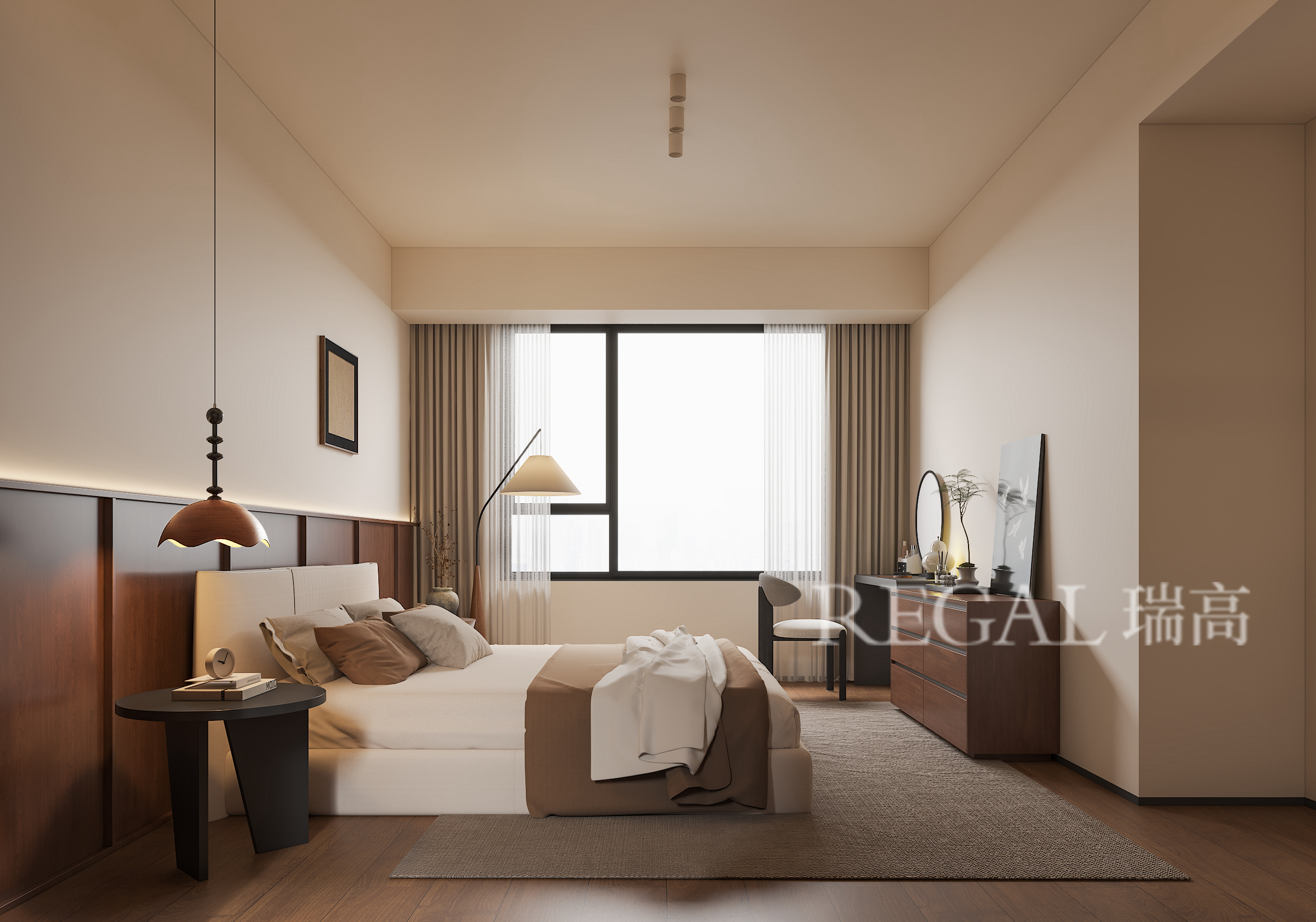 本案风格设计定位为现代中古,中古风设计理念强调对特定历史时期美学的回溯与提炼, 注重设计的实用性与筒洁性, 这在中古风家具设计上体现为线条流畅、造型简约, 减少不必要装饰。