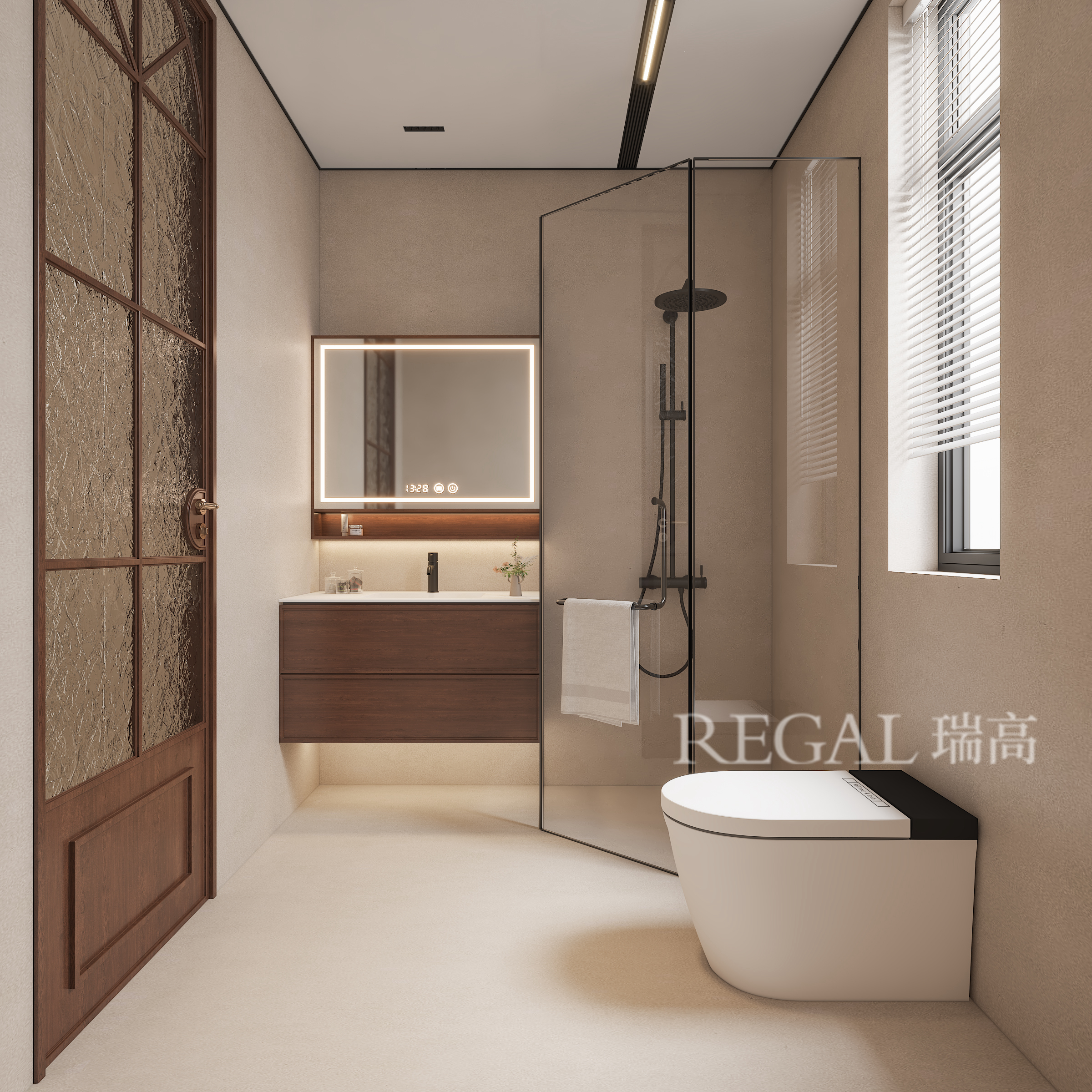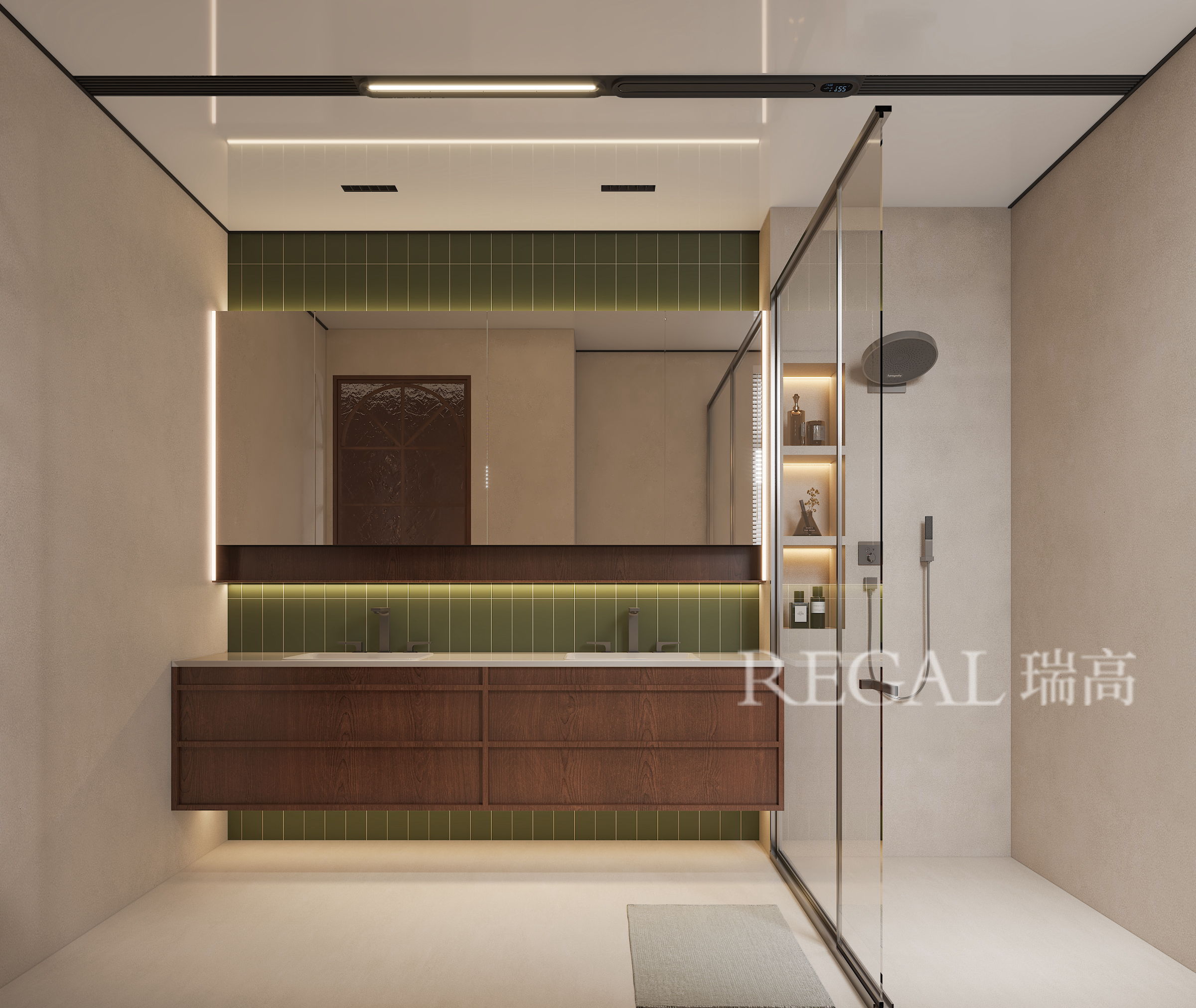 在主卫设计中,我们大面采用素色的瓷砖搭配了比较亮眼一面造型花砖,使整体氛围感更强。