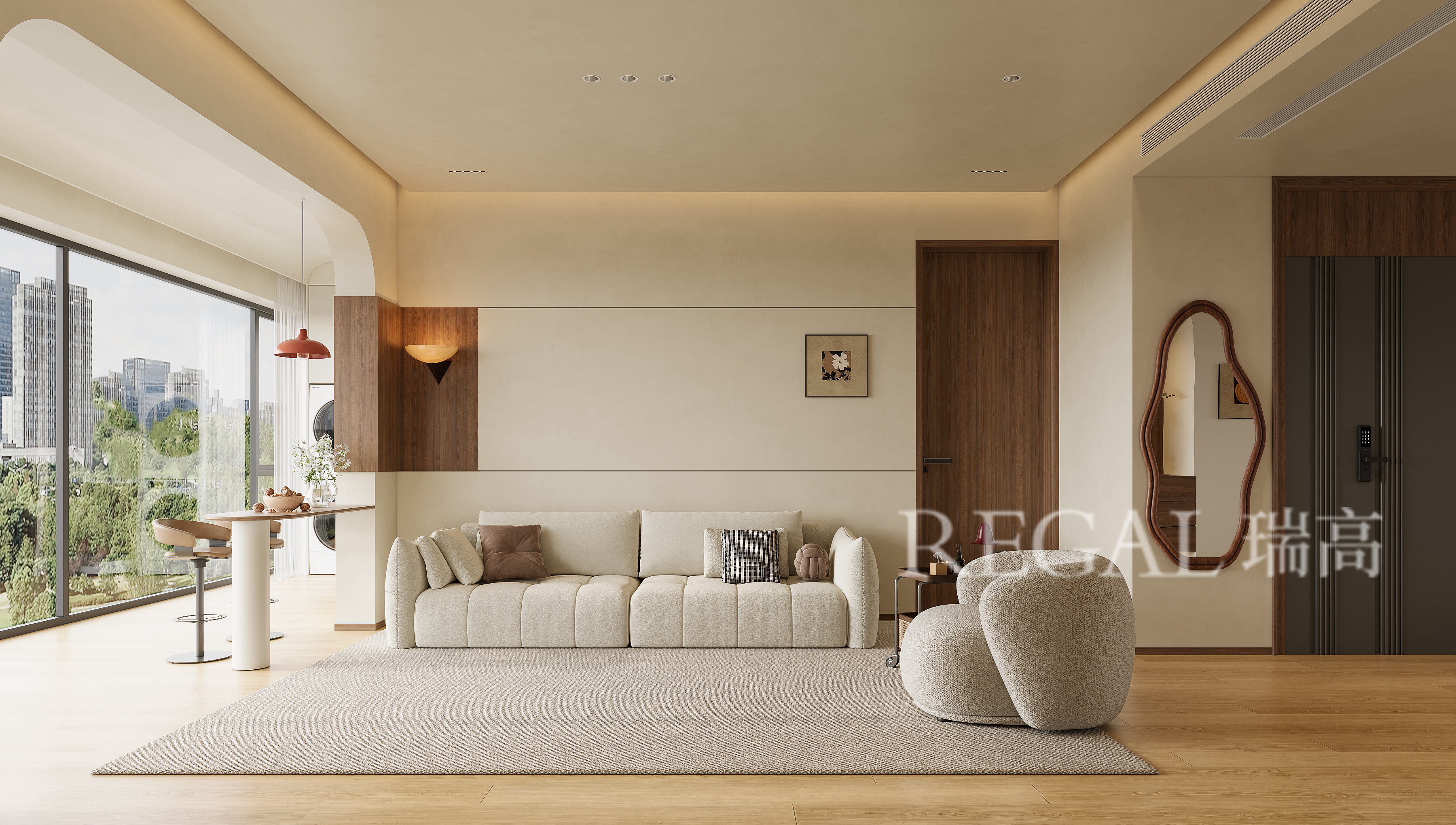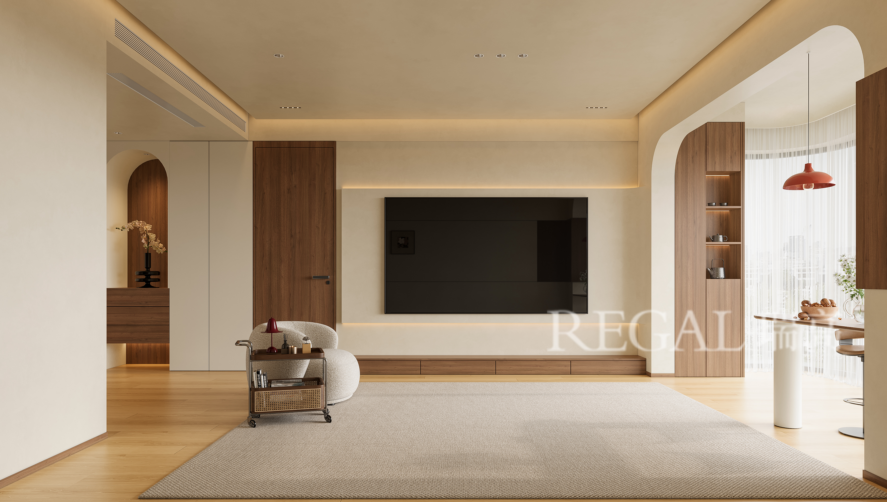 这是一套现代暖调风格的中古风案例,业主一家4口,喜欢简单舒适的家,女业主喜欢中古元素,不想要太复杂的,既简单又舒服的生活空间,结合户型结构,本案就采用了客餐厨一体化家居空间,整体设计既通透又有质感:风格与色调表现上主打温暖的「现代轻复古」,以胡桃木色木纹、柔和米色为基底,搭配深灰厨房柜体做层次,氛围温馨又高级。采用拱形元素柔化空间线条,带点优雅复古感;开放式布局让客餐厨连通,显大又通透;灯光层次丰富,既满足照明又烘托氛围,嵌入式收纳柜,兼顾美观与实用。