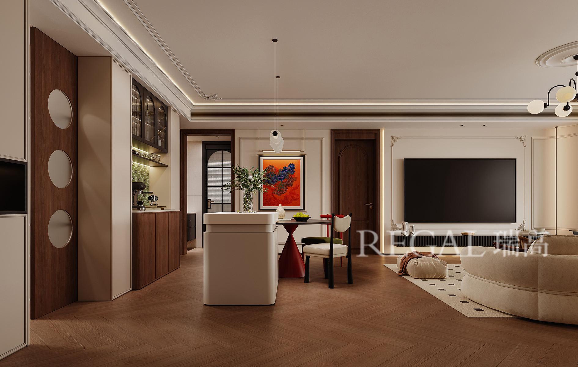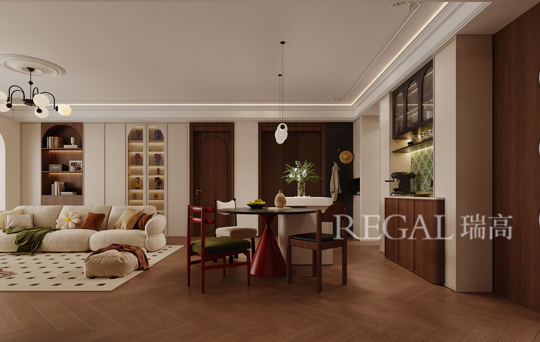 这是一套现代暖调风格的中古风案例,业主一家4口,喜欢简单舒适的家,女业主喜欢中古元素,不想要太复杂的,既简单又舒服的生活空间,结合户型结构,本案就采用了客餐厨一体化家居空间,整体设计既通透又有质感:风格与色调表现上主打温暖的「现代轻复古」,以胡桃木色木纹、柔和米色为基底,搭配深灰厨房柜体做层次,氛围温馨又高级。采用拱形元素柔化空间线条,带点优雅复古感;开放式布局让客餐厨连通,显大又通透;灯光层次丰富,既满足照明又烘托氛围,嵌入式收纳柜,兼顾美观与实用。
