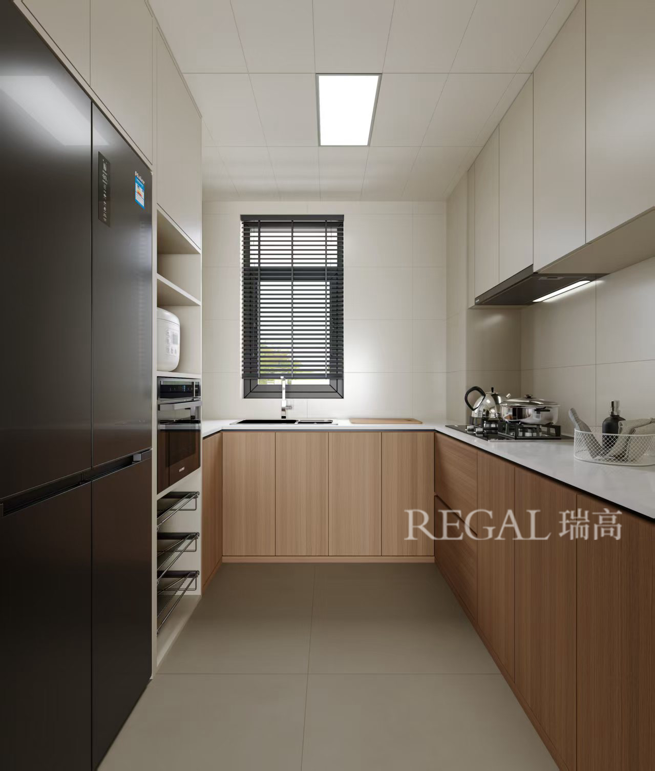 厨房是以同色系柜面、嵌入式家电弱化硬质边界,同时用灯光层次(氛围灯 / 线性灯)强化空间呼吸感,让功能与美学在自然语境中实现共生。