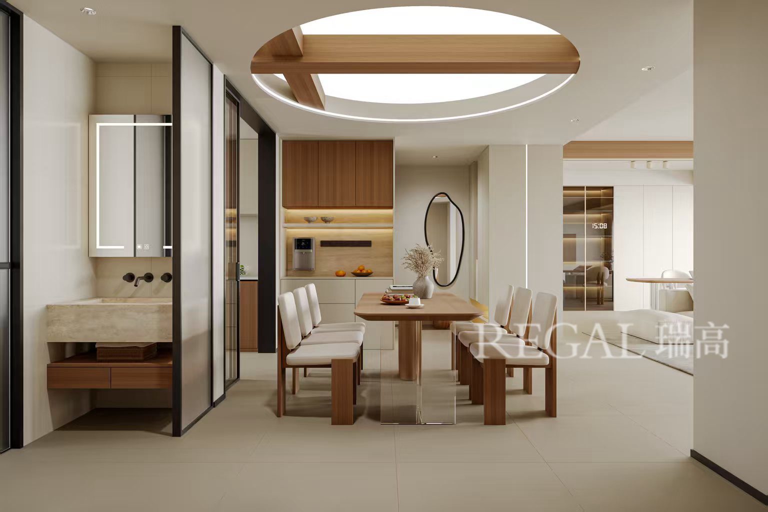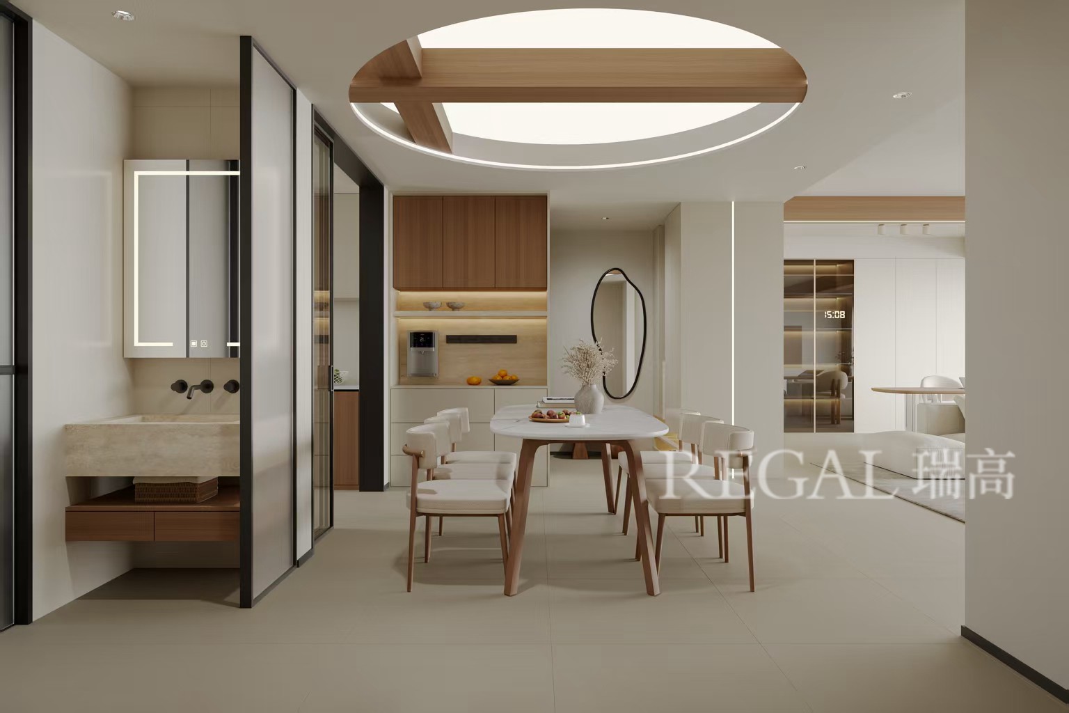 客餐厨采用 LDK 一体化布局,弧形吊顶与线性灯弱化边界,餐厅兼作社交与操作界面,玻璃移门可灵活切换开放 / 封闭模式。