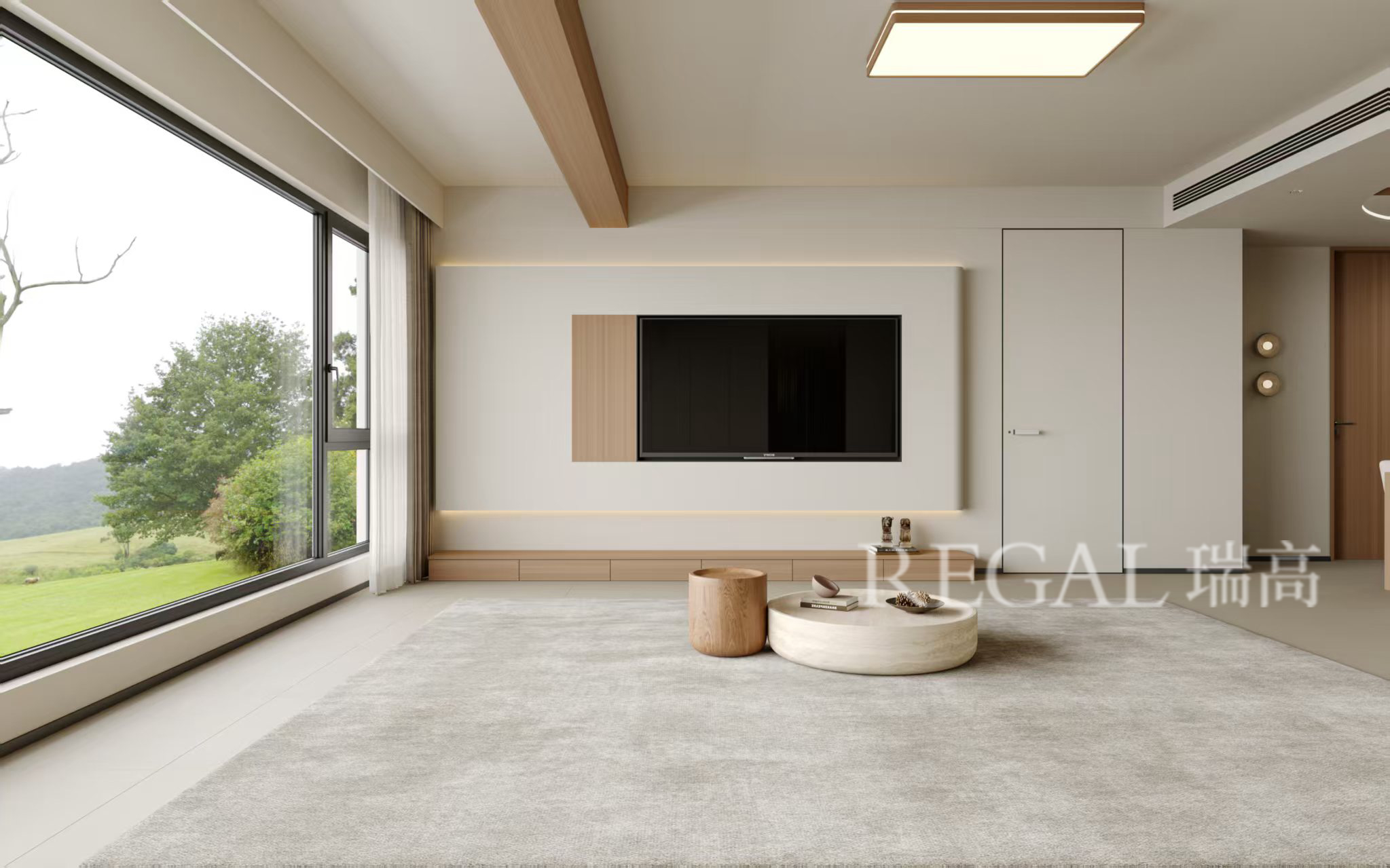 客厅以悬浮背景墙拓展视觉纵深,大面窗引入自然景观,将室外绿意转化为空间软装;卧室用弧形转角 + 肌理墙布营造包裹感,局部跳色软装点缀,在极简中保留温度。