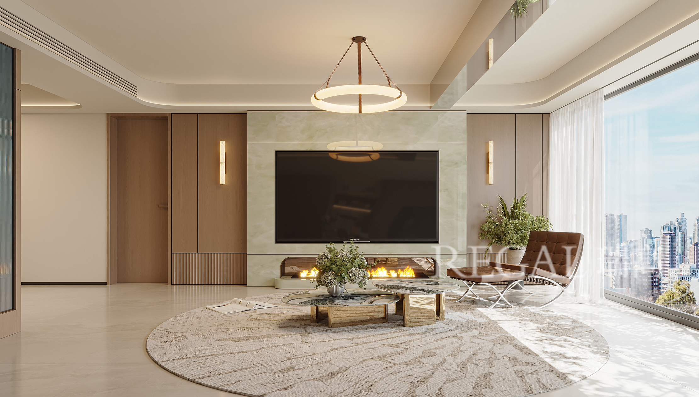 采光与视野:超大落地窗 + 柔纱帘,既引入充足自然采光,又柔化光线;同时能直接俯瞰城市景观,提升空间氛围感。
