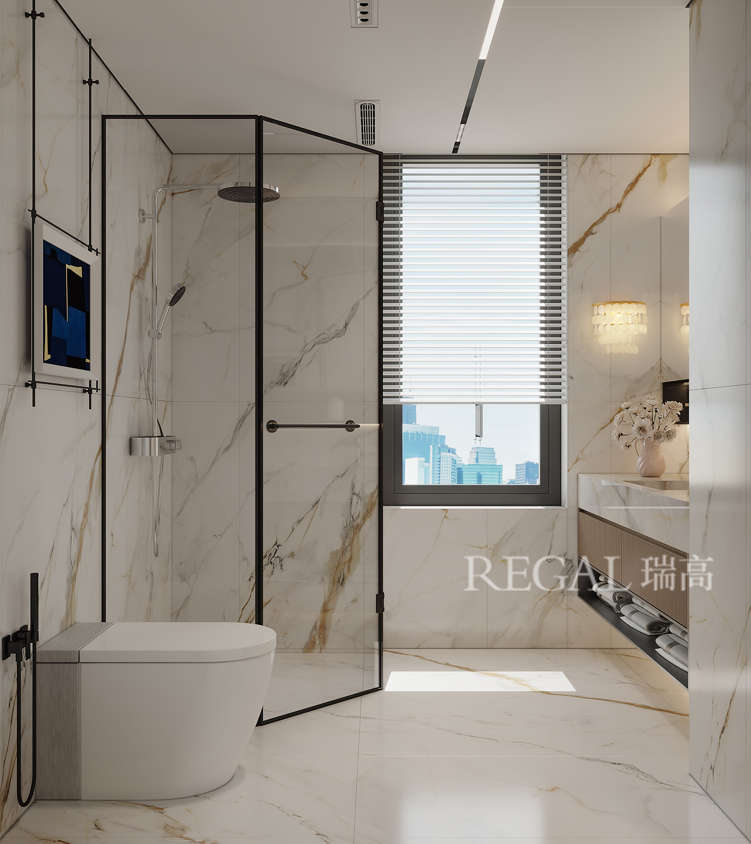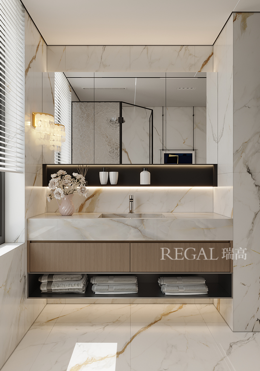 镜柜设计巧妙,通顶镜面延伸了视觉高度,下方黑色置物台嵌入灯带,既提供柔和补光,又可摆放洗漱用品与花艺装饰,细节处尽显精致。左侧的百叶窗引入自然光线,搭配艺术感玻璃壁灯,让光影在大理石与木色间交错,整体氛围干净治愈又充满高级感,完美平衡了功能与美学。