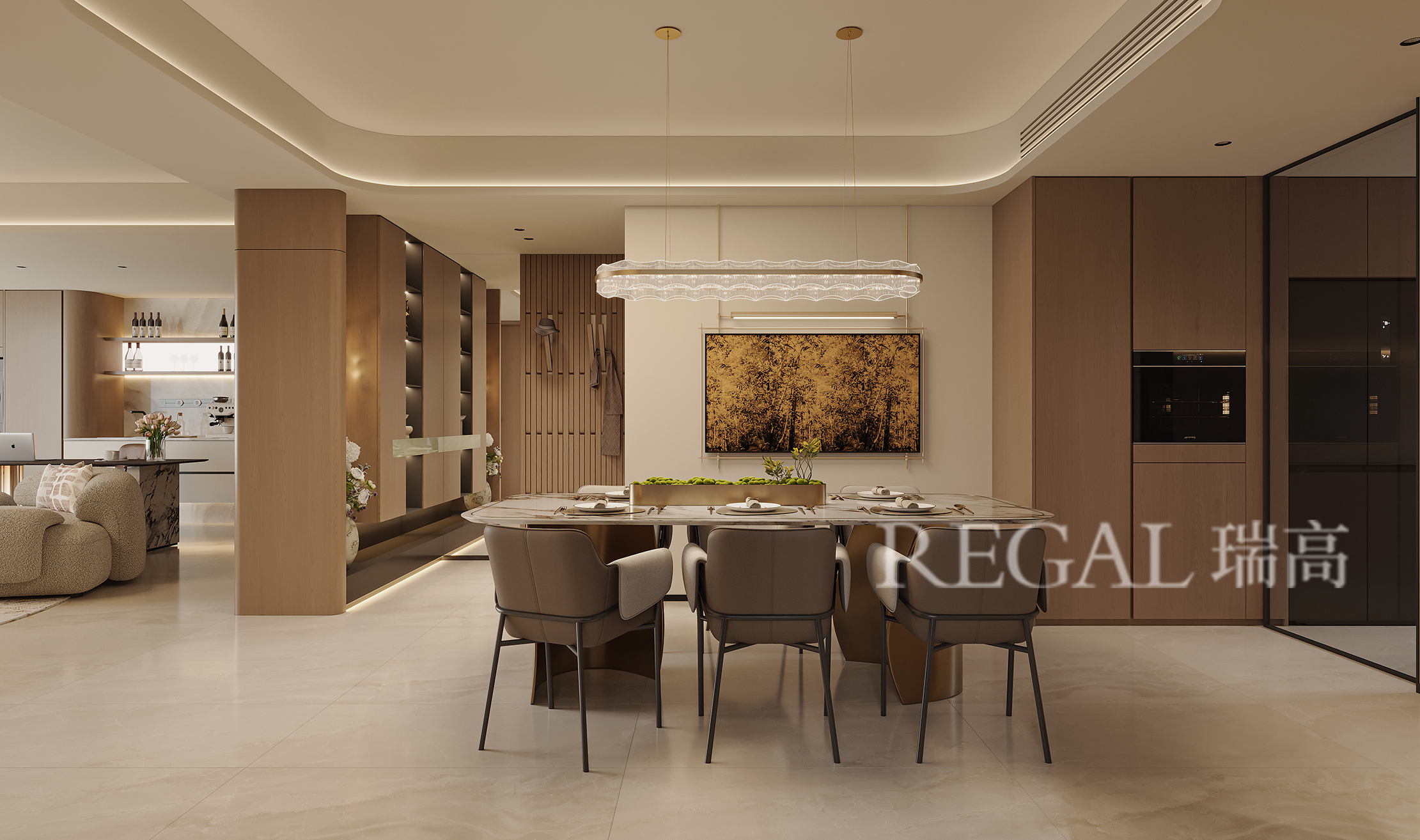 开放式住宅餐厅,与客厅、西厨无缝衔接,整体氛围温润、高级且充满生活仪式感。