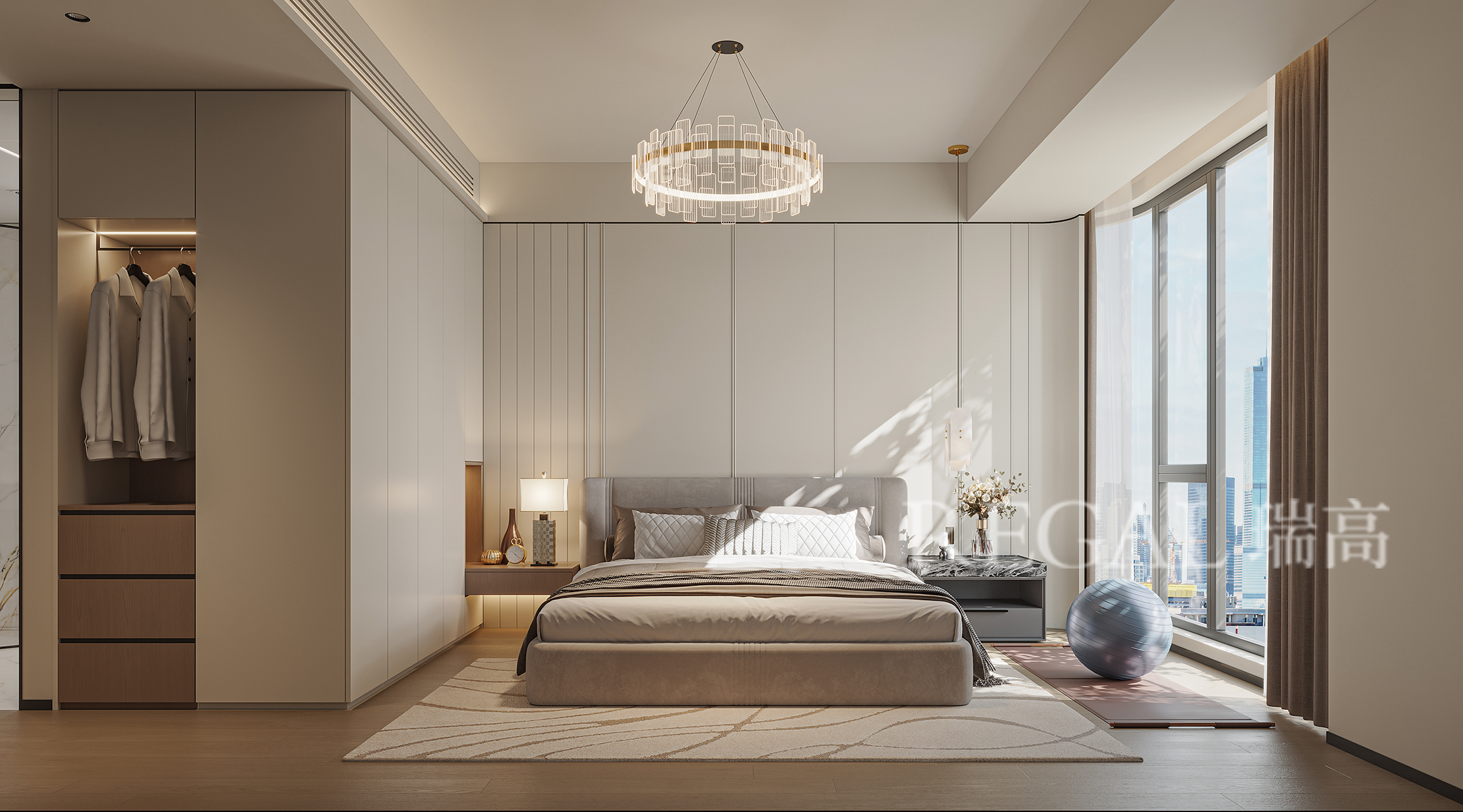 卧室采用自然静奢,身心热爱,更强调宁静、治愈的氛围。运用微水泥、木质等营造包裹感,色彩更统一柔和,身心在此得到彻底的安放。