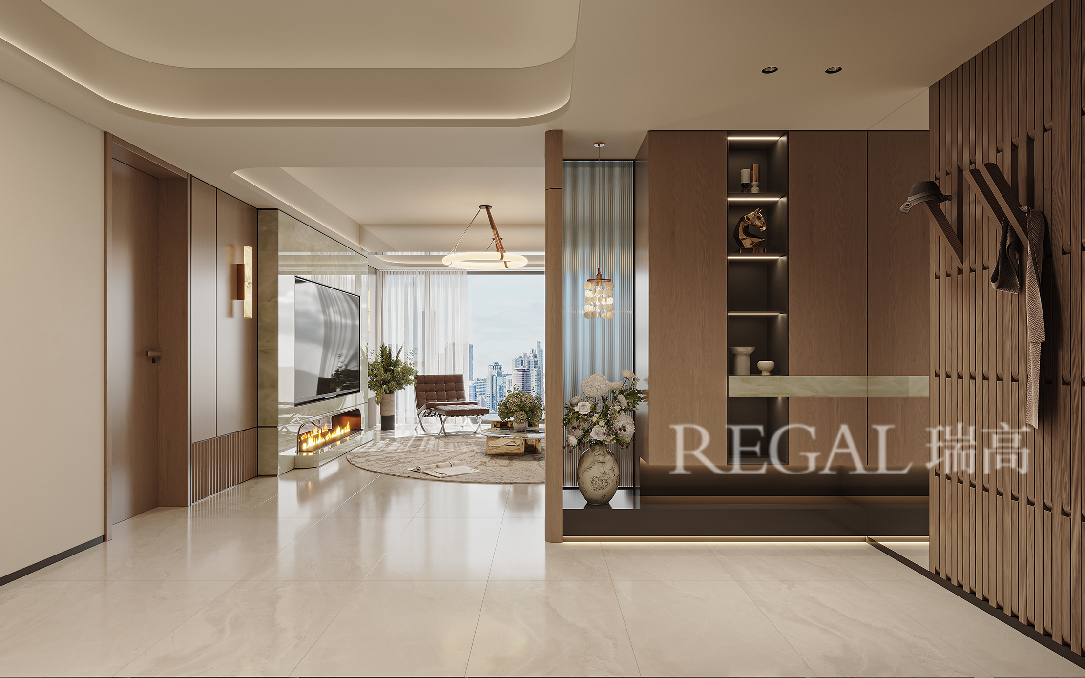 玄关处采用顶面弧形灯带勾勒层次,柜体嵌入式灯带、壁炉火焰光、艺术挂灯共同营造温暖氛围。