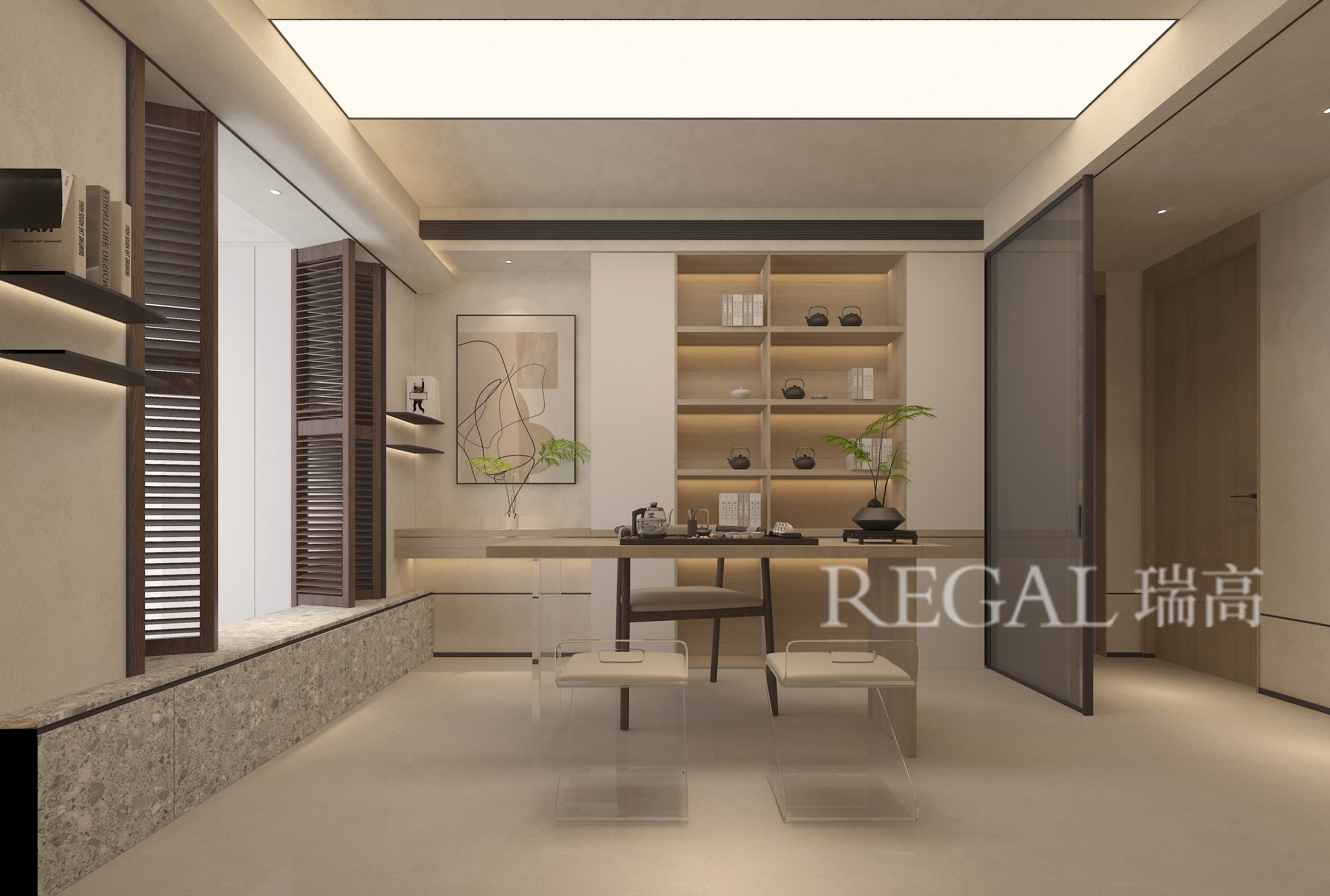 现代禅意风的多功能空间,融合了茶室与书房功能,核心是「极简 + 自然 + 东方意境」,营造出静谧、雅致的沉浸式氛围。
