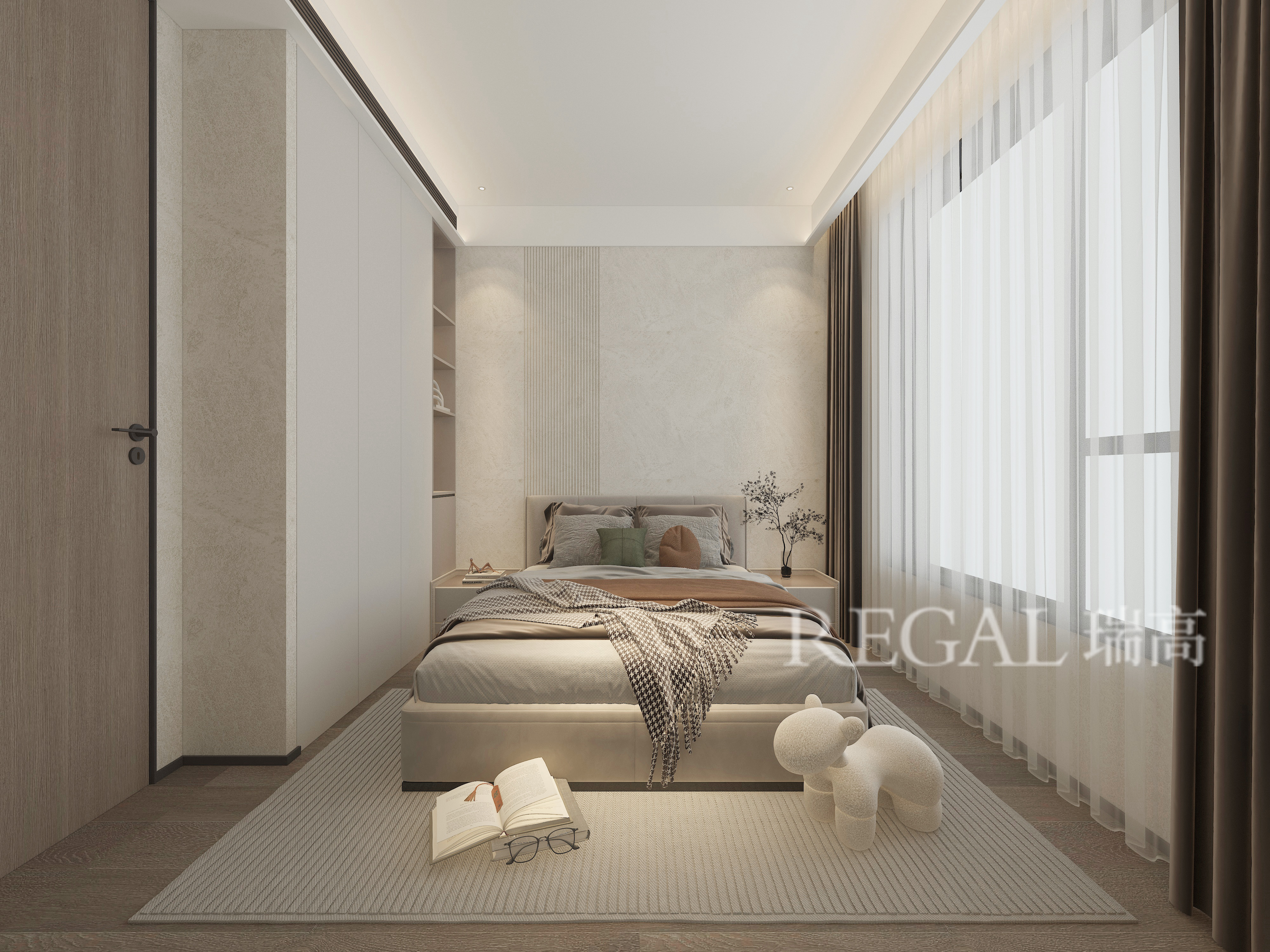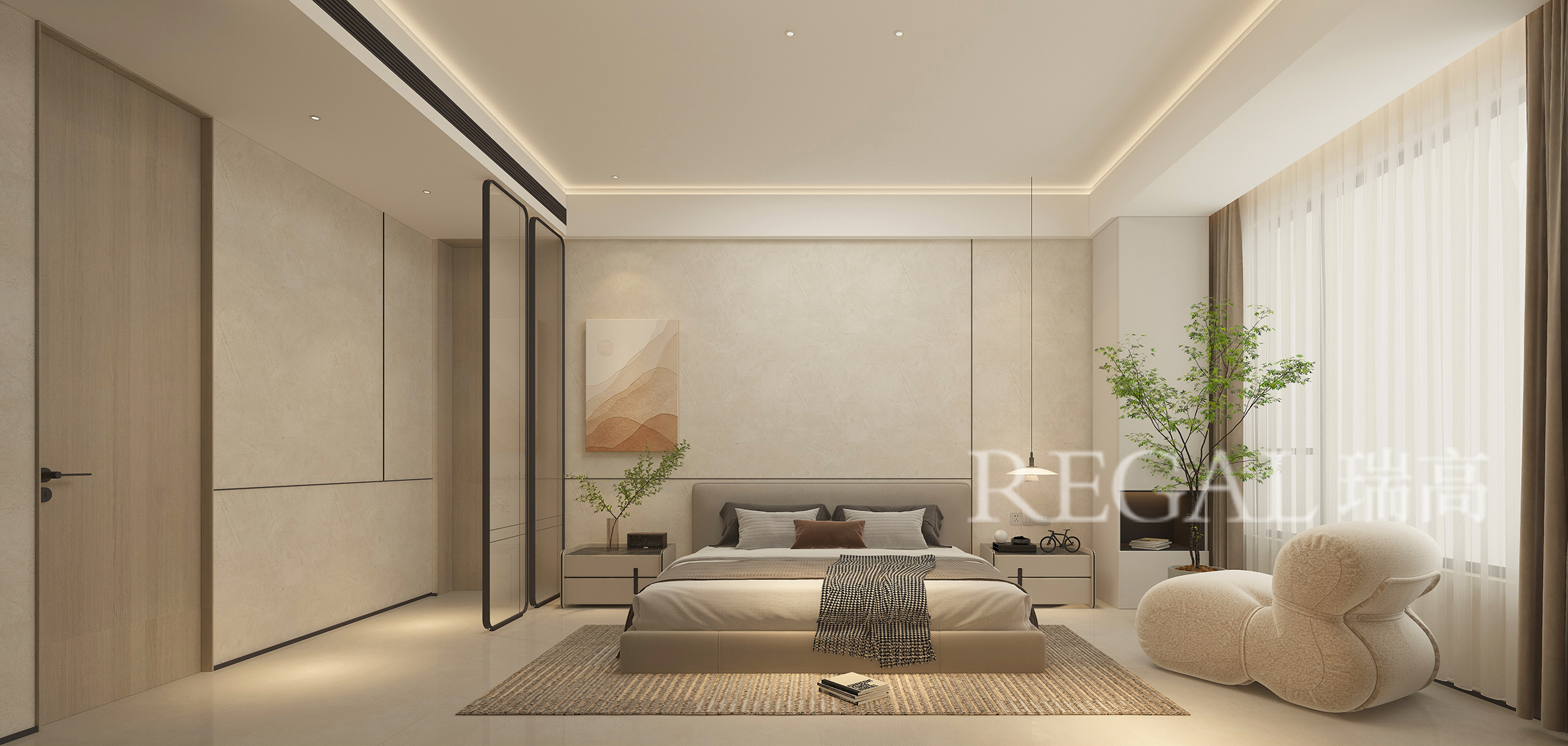 这是一间现代极简风卧室,以「米白 + 暖棕」为基调,用克制的设计营造出静谧、松弛的休憩氛围。 墙面通铺浅米色艺术漆,搭配细腻的竖向分缝,简洁利落又不失质感;左侧整面木饰面隐形门与玻璃移门,将收纳区与睡眠区自然分隔,保证空间整洁通透。