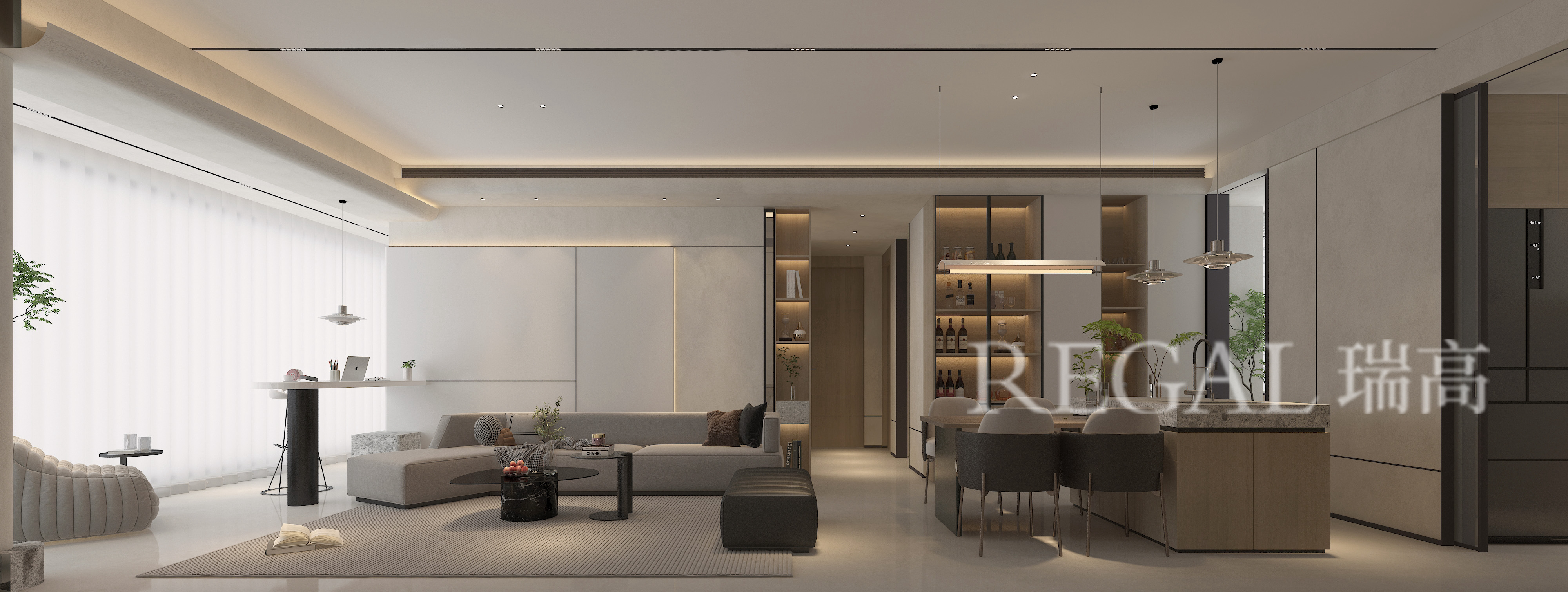 本项目为一座220平方米的现代都市大平层宅邸。设计旨在打破传统布局,创造一个开放式、社交型、充满流动感的居住空间。核心理念为“居中为核,南北贯通”,通过将客厅置于中心,并采用背靠背沙发形成回游动线,完美契合南北通透的户型优势,让空间成为连接家庭情感与社交生活的核心场域。设计强调材质的天然质感与碰撞,营造一个既大气磅礴又温暖舒适的生活居所。