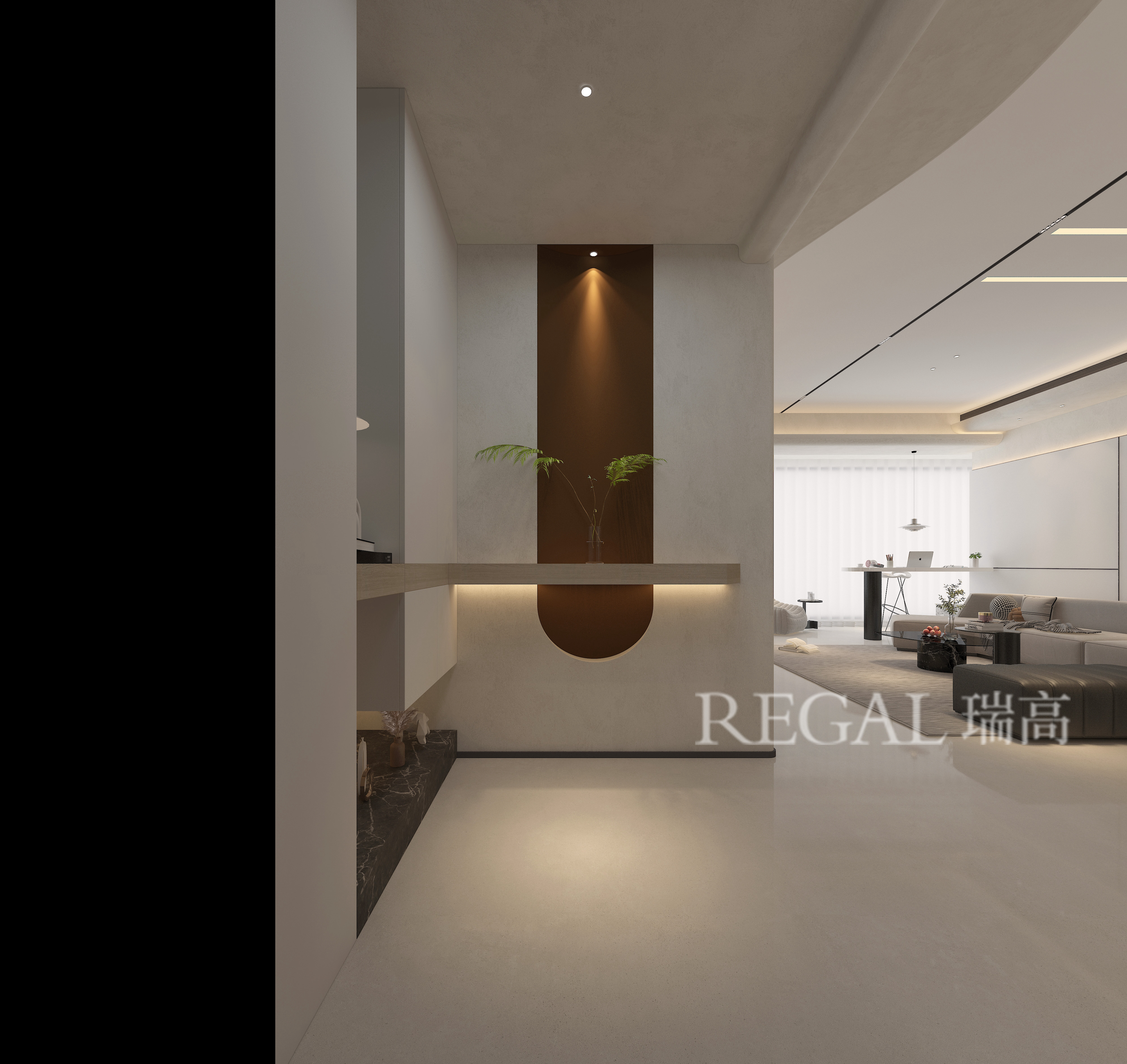 墙面采用微水泥浅灰质感基底,中间嵌入一块深棕 U 形装饰板,上下呼应的弧形线条打破了方正感,成为空间的视觉锚点。