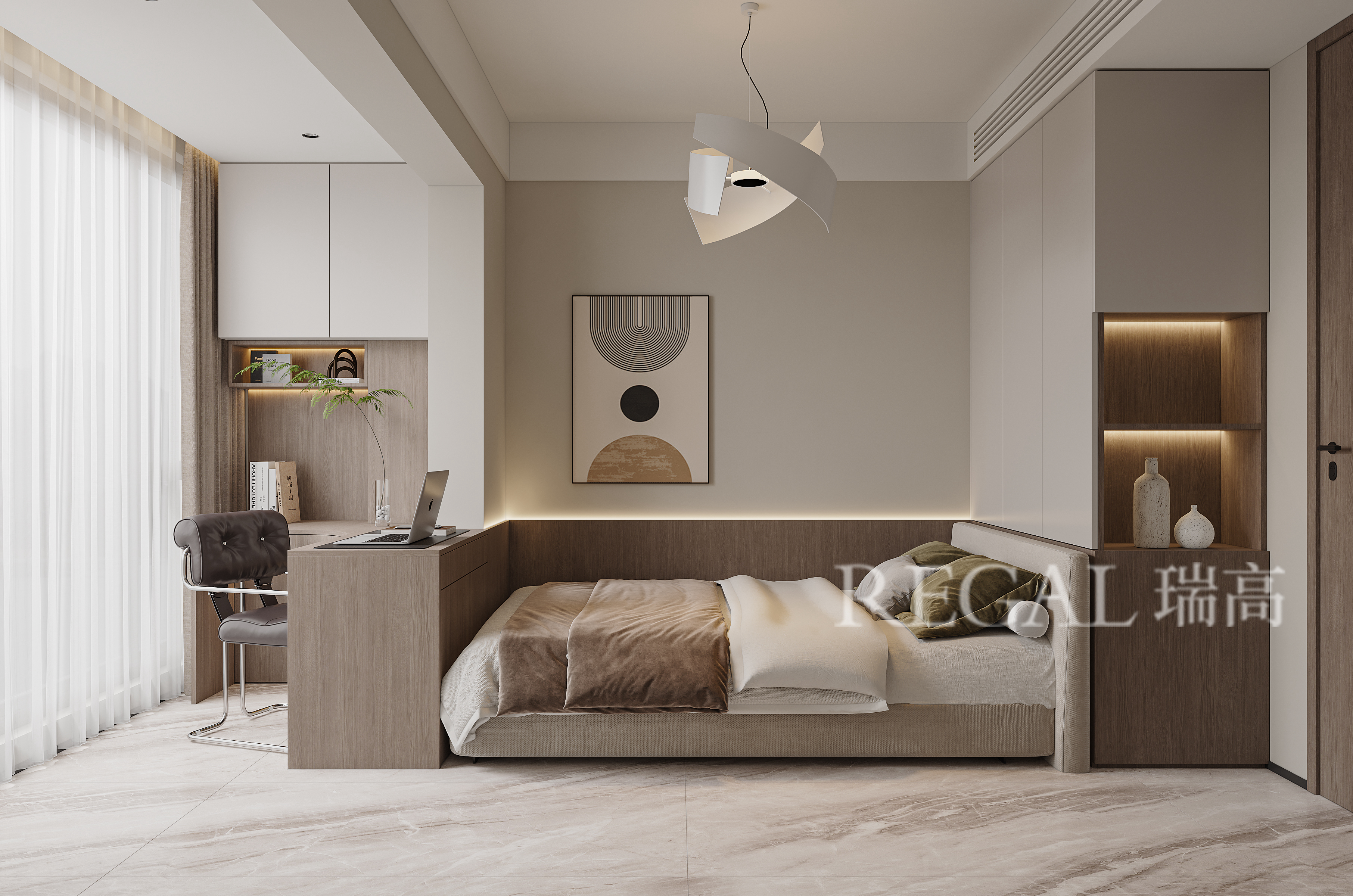 采光与视野:超大落地窗 + 柔纱帘,既引入充足自然采光,又柔化光线;同时能直接俯瞰城市景观,提升空间氛围感。