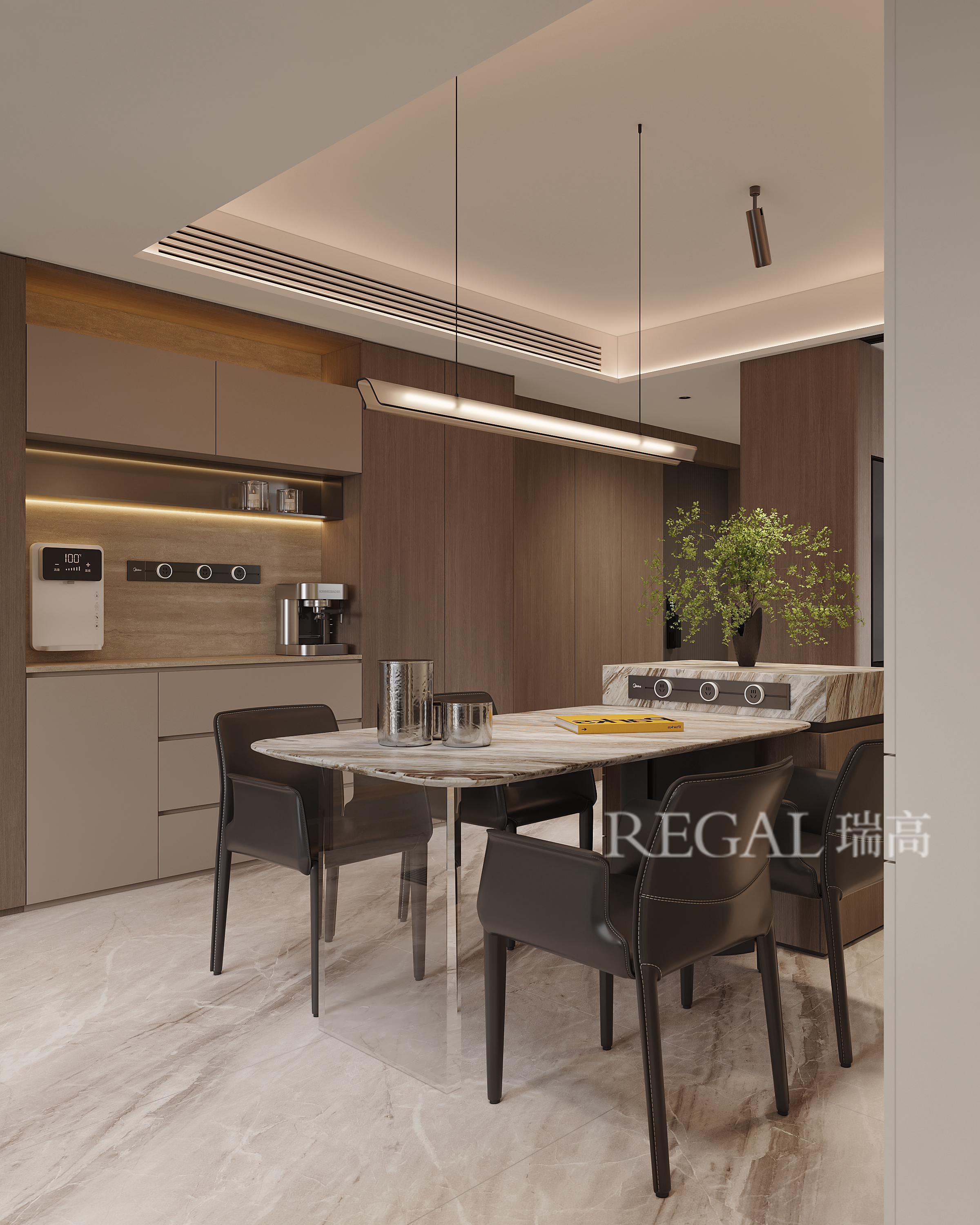 以“极简线条 + 高级材质 + 低调奢华”为设计理念,延续意式精致并融入现代舒适。墙面与柜体多采用“无把手”设计,彰显意式简约美学。整体以低饱和度的暖棕、浅灰为主色调,搭配深咖与哑光黑点缀,营造沉稳高级氛围,通过材质碰撞展现意式精致。