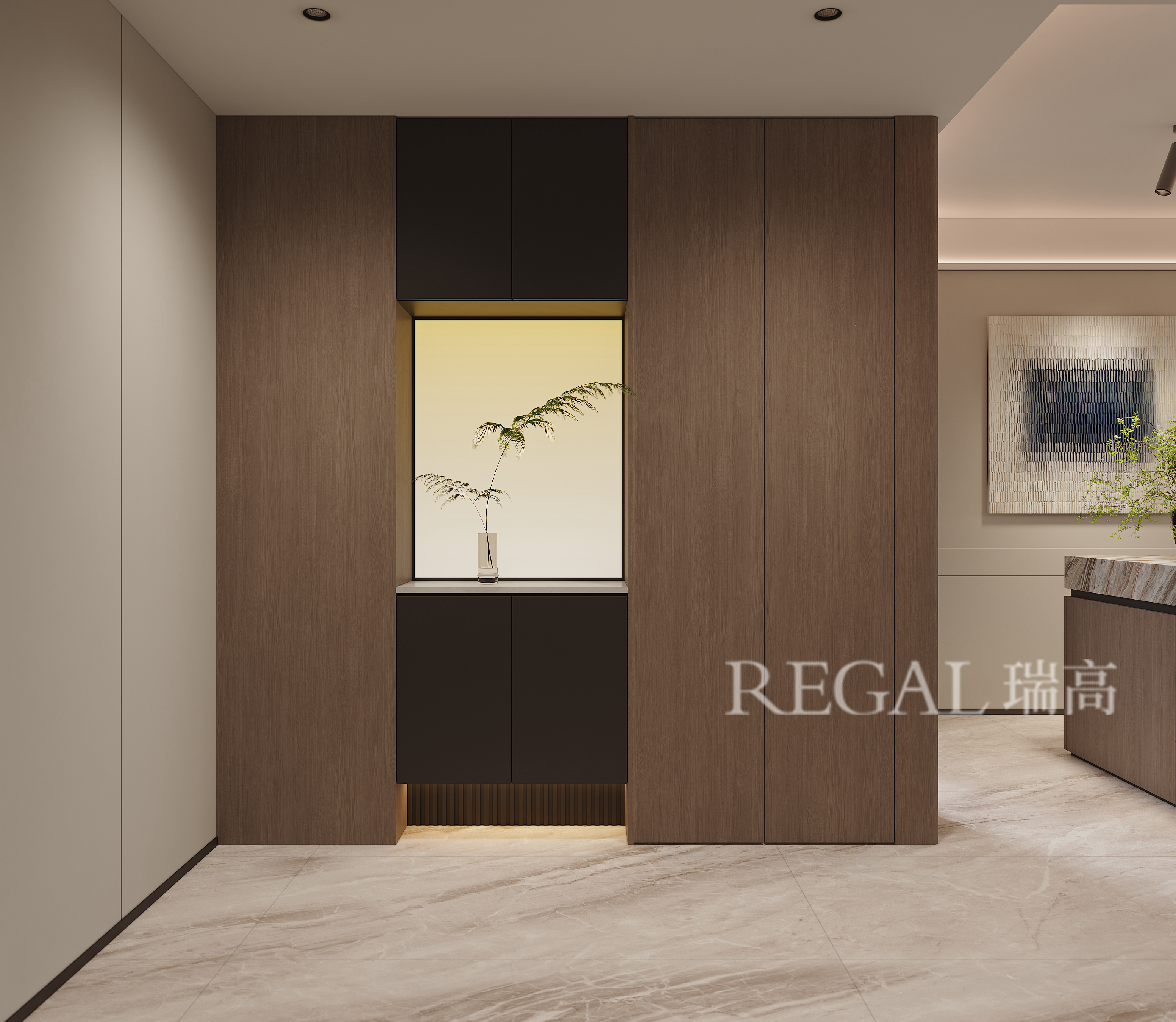 意式轻奢的灵魂在于「克制的张扬」,当融入温润木色后,更演变为一曲理性与温度的协奏。它以极简的线条和中性色调为骨架,再以烟熏橡木的深邃、胡桃木的纹理、或是白蜡木的清浅作为空间的情感纽带——木色的暖与岩板的冷、金属的利落、皮革的柔软形成微妙对抗,在秩序井然的几何构图里注入自然呼吸感。