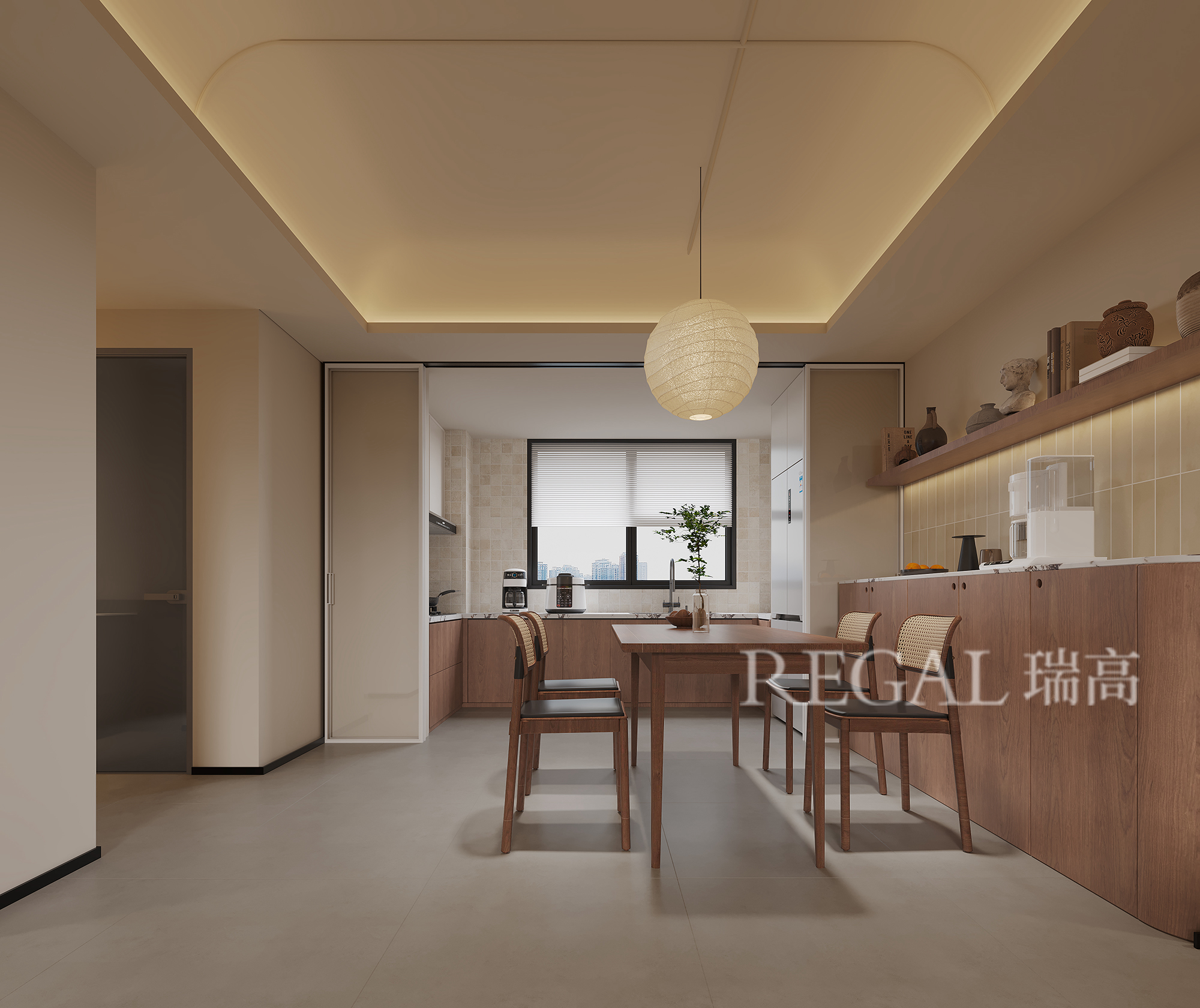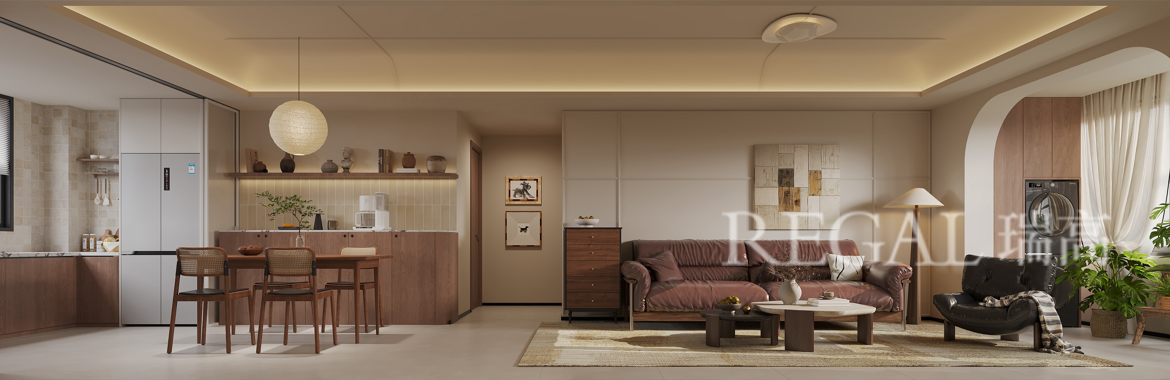 空间布局 客餐厨一体化设计,通透互动;利用家具与材质自然划分功能区,层次分明。 材质与色彩 选用浅木、乳胶漆等天然材质;以大地色系为基底,营造柔和沉静的视觉感受。