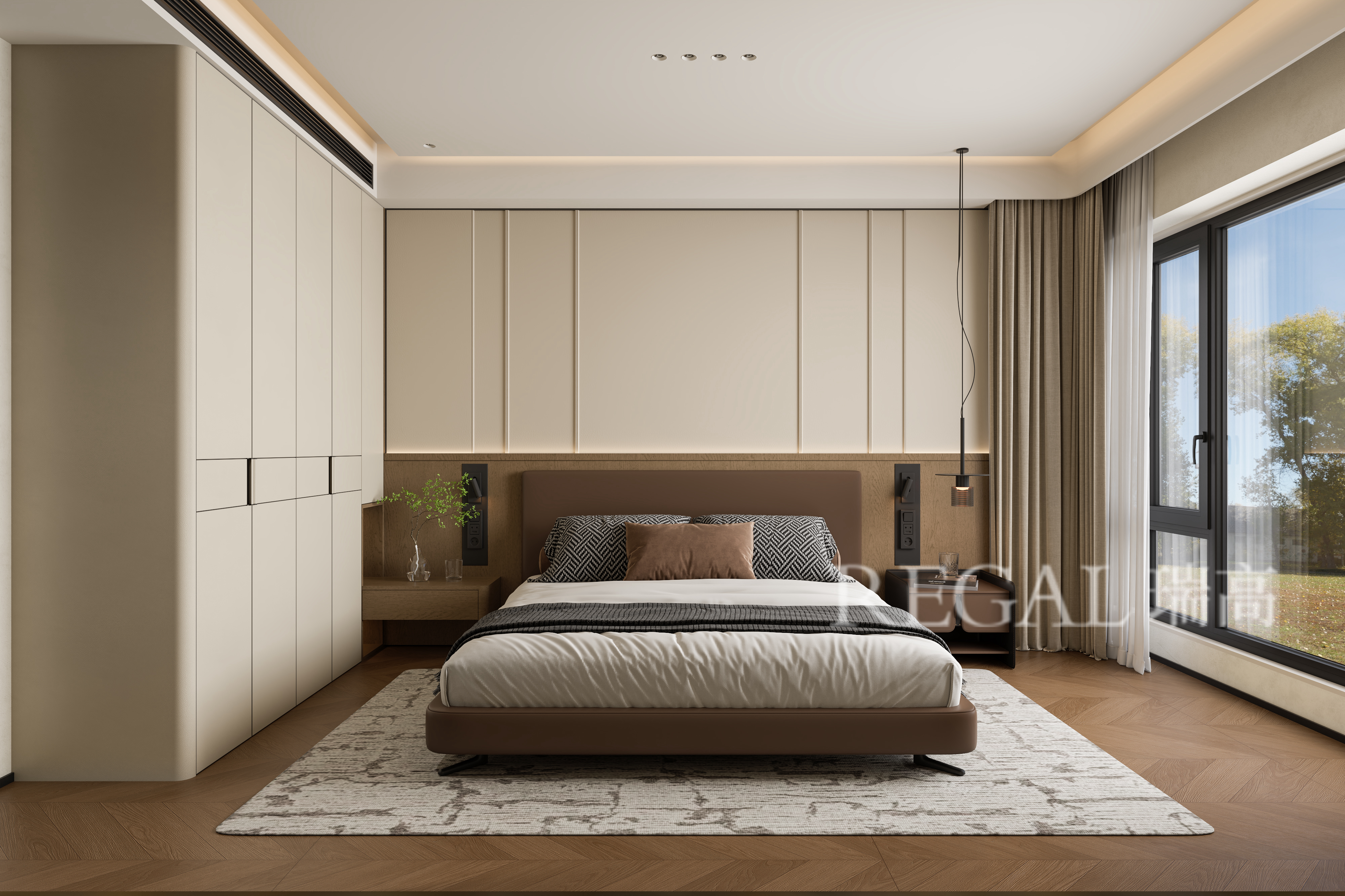 采光与视野:超大落地窗 + 柔纱帘,既引入充足自然采光,又柔化光线;同时能直接俯瞰城市景观,提升空间氛围感。