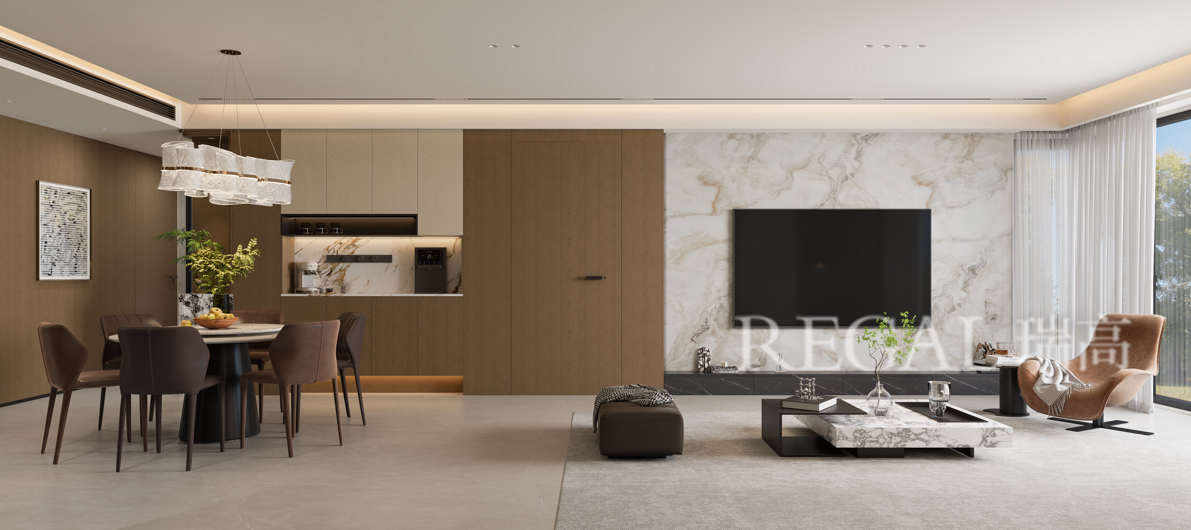 材质质感:暖棕木饰面 + 金属(茶几 / 吊灯 / 柜框)+ 光亮石材地面 + 局部大理石纹理,多重材质叠加出高级轻奢感。