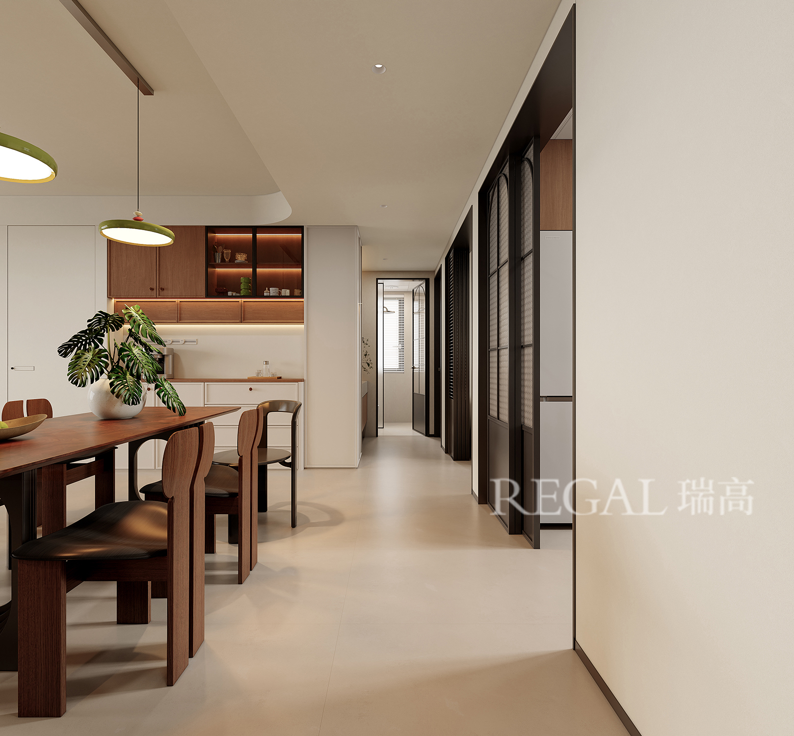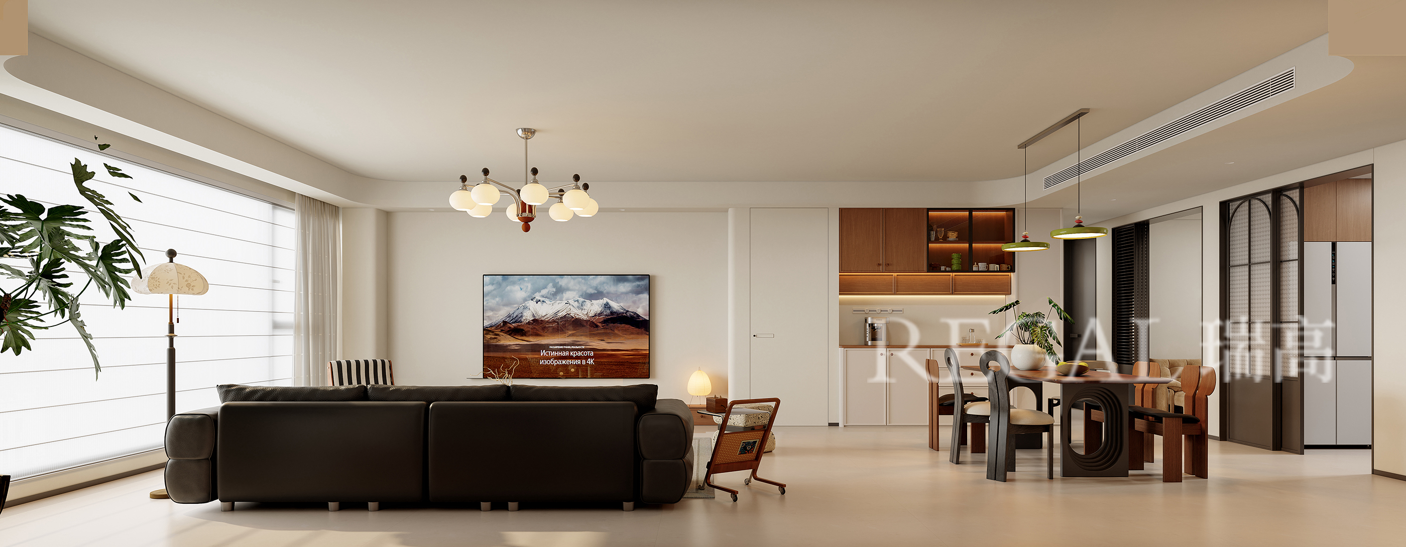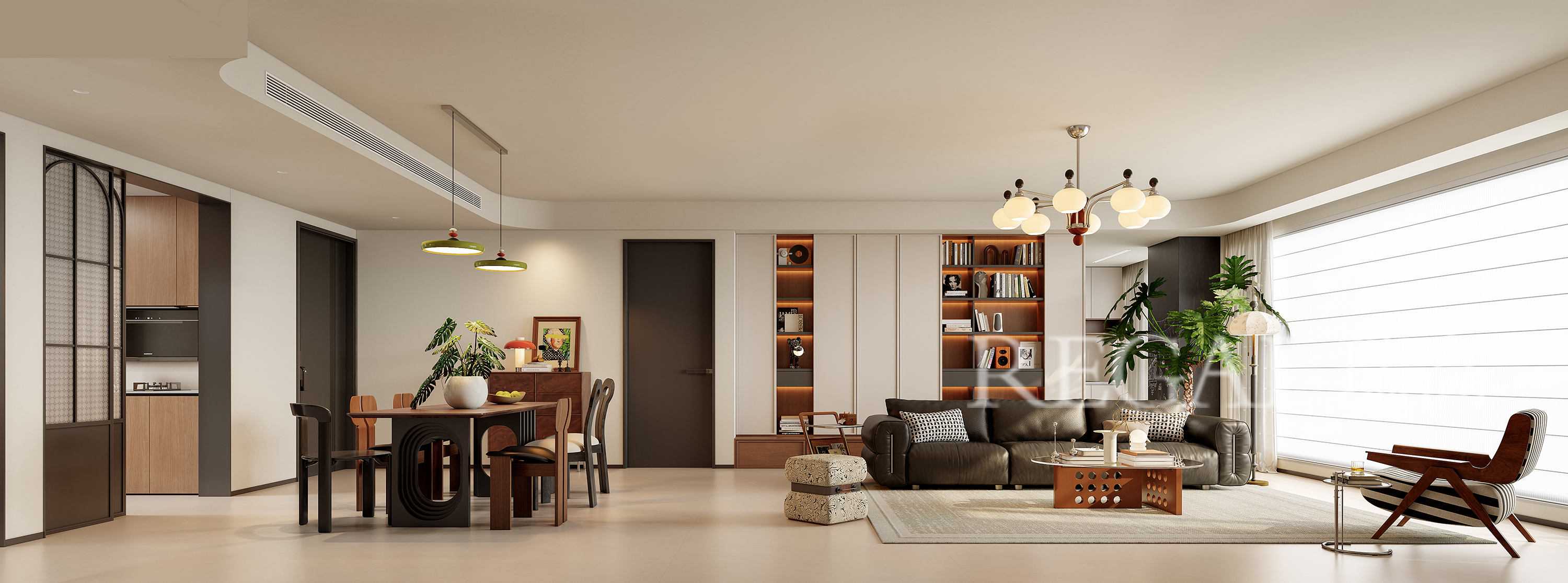 这是一套现代暖调风格的中古风案例,业主一家4口,喜欢简单舒适的家,女业主喜欢中古元素,不想要太复杂的,既简单又舒服的生活空间,结合户型结构,本案就采用了客餐厨一体化家居空间,整体设计既通透又有质感:风格与色调表现上主打温暖的「现代轻复古」,以胡桃木色木纹、柔和米色为基底,搭配深灰厨房柜体做层次,氛围温馨又高级。采用拱形元素柔化空间线条,带点优雅复古感;开放式布局让客餐厨连通,显大又通透;灯光层次丰富,既满足照明又烘托氛围,嵌入式收纳柜,兼顾美观与实用。