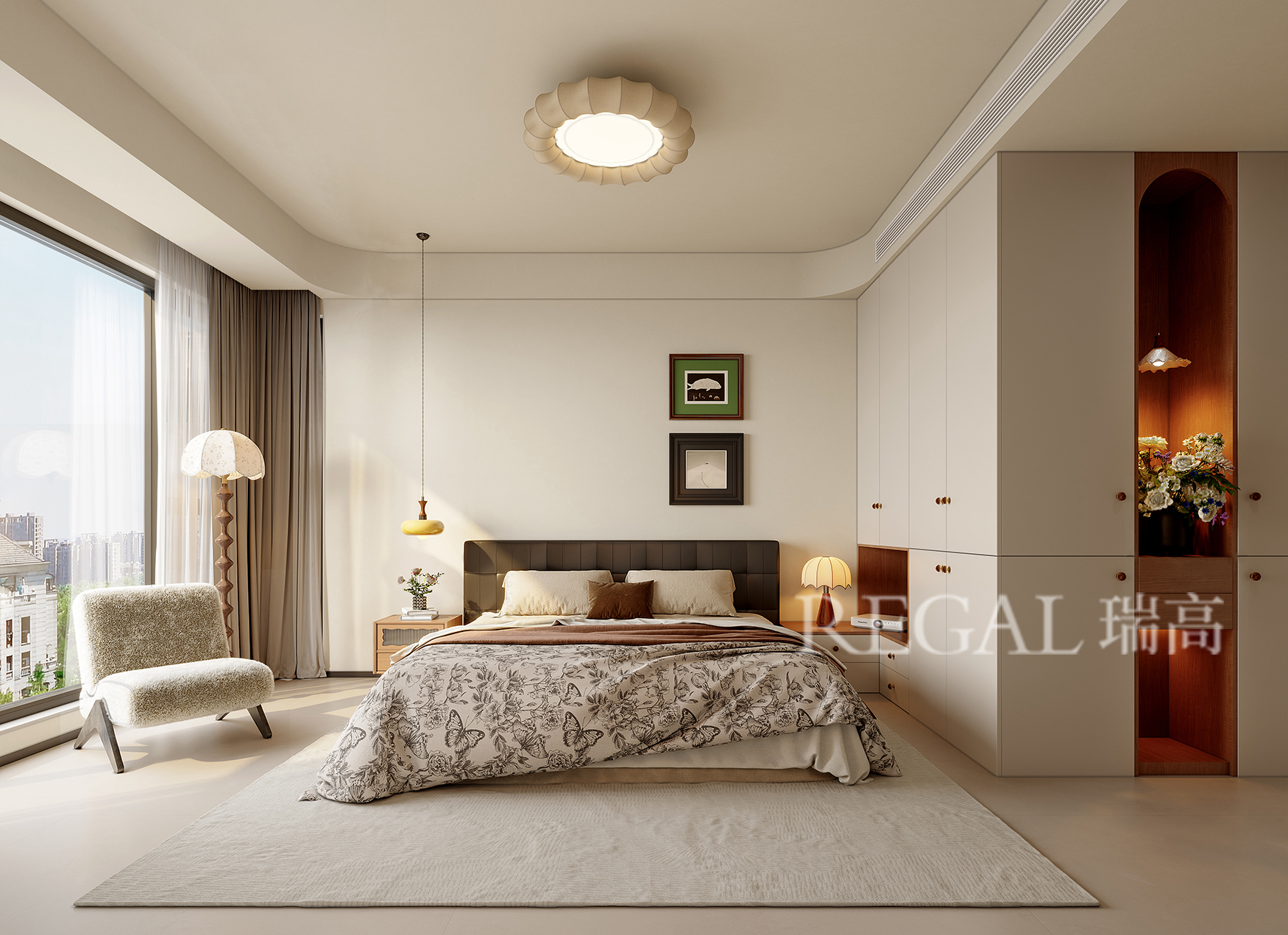 本案为现代中古风格,设计处处以业主的品味和需求为中心来考量,围绕品质与优雅来展开。色彩上以浅色调为主,彰显空间的静谧与温暖。