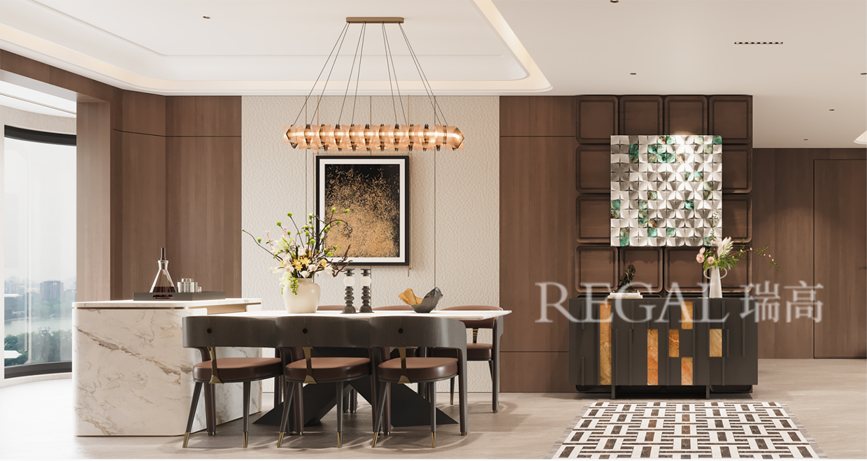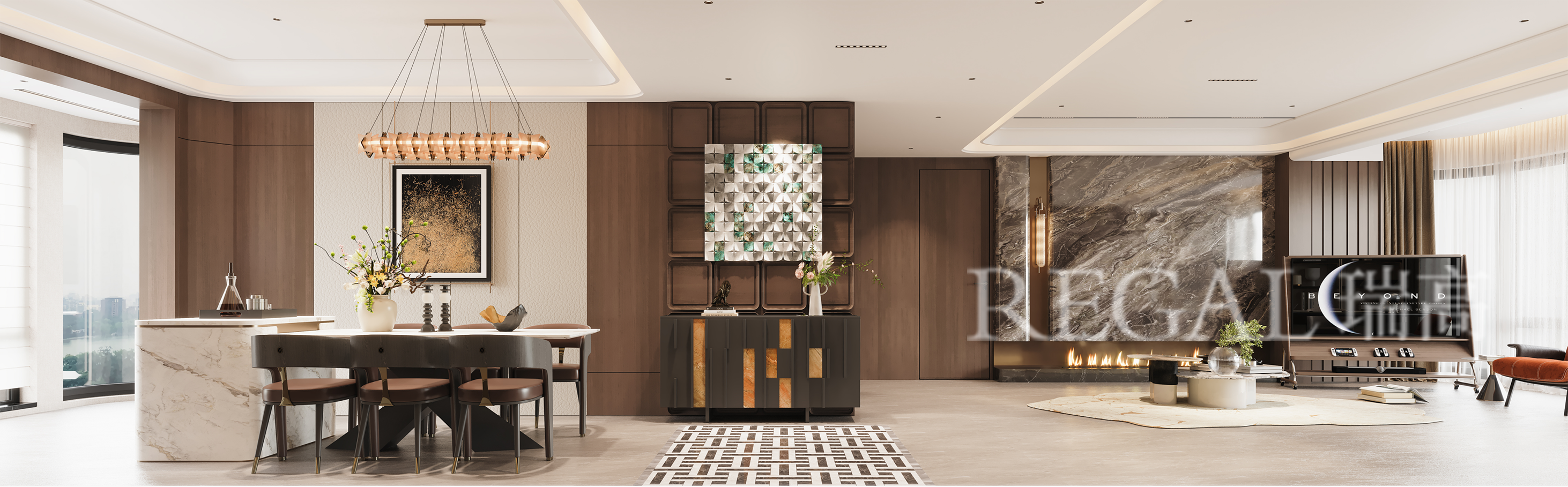 材质质感:暖棕木饰面 + 金属(茶几 / 吊灯 / 柜框)+ 光亮石材地面 + 局部大理石纹理,多重材质叠加出高级轻奢感。