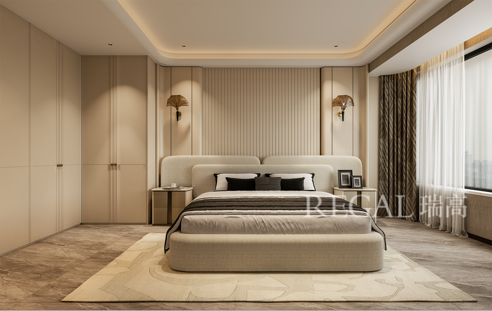 采光与视野:超大落地窗 + 柔纱帘,既引入充足自然采光,又柔化光线;同时能直接俯瞰城市景观,提升空间氛围感。