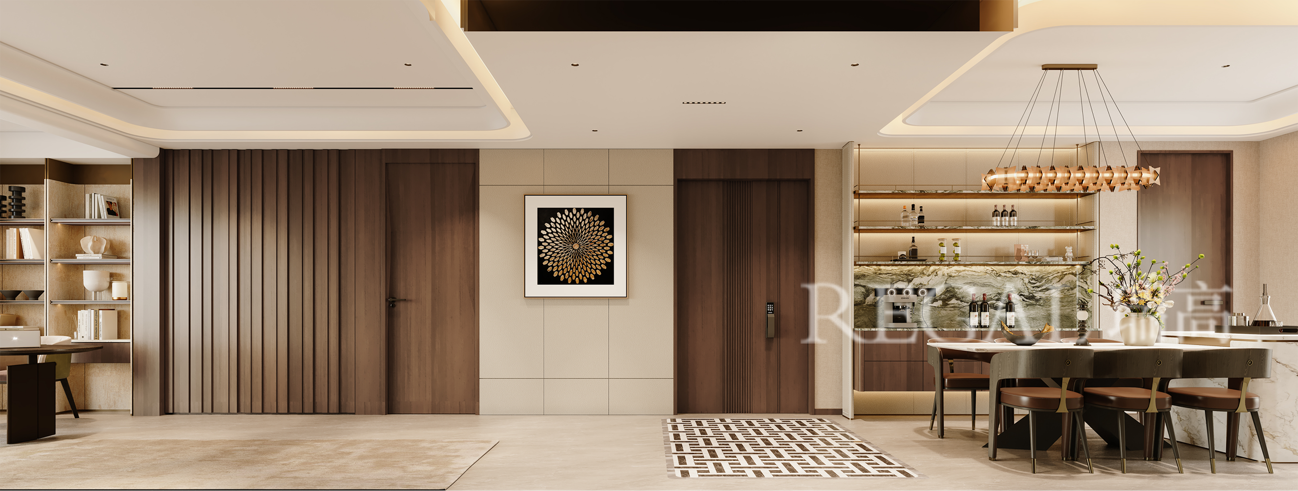 本案以意式优雅融合老钱风沉稳质感,入户玄关背景墙奠定雅致基调,全房无主灯设计营造柔和高级氛围。