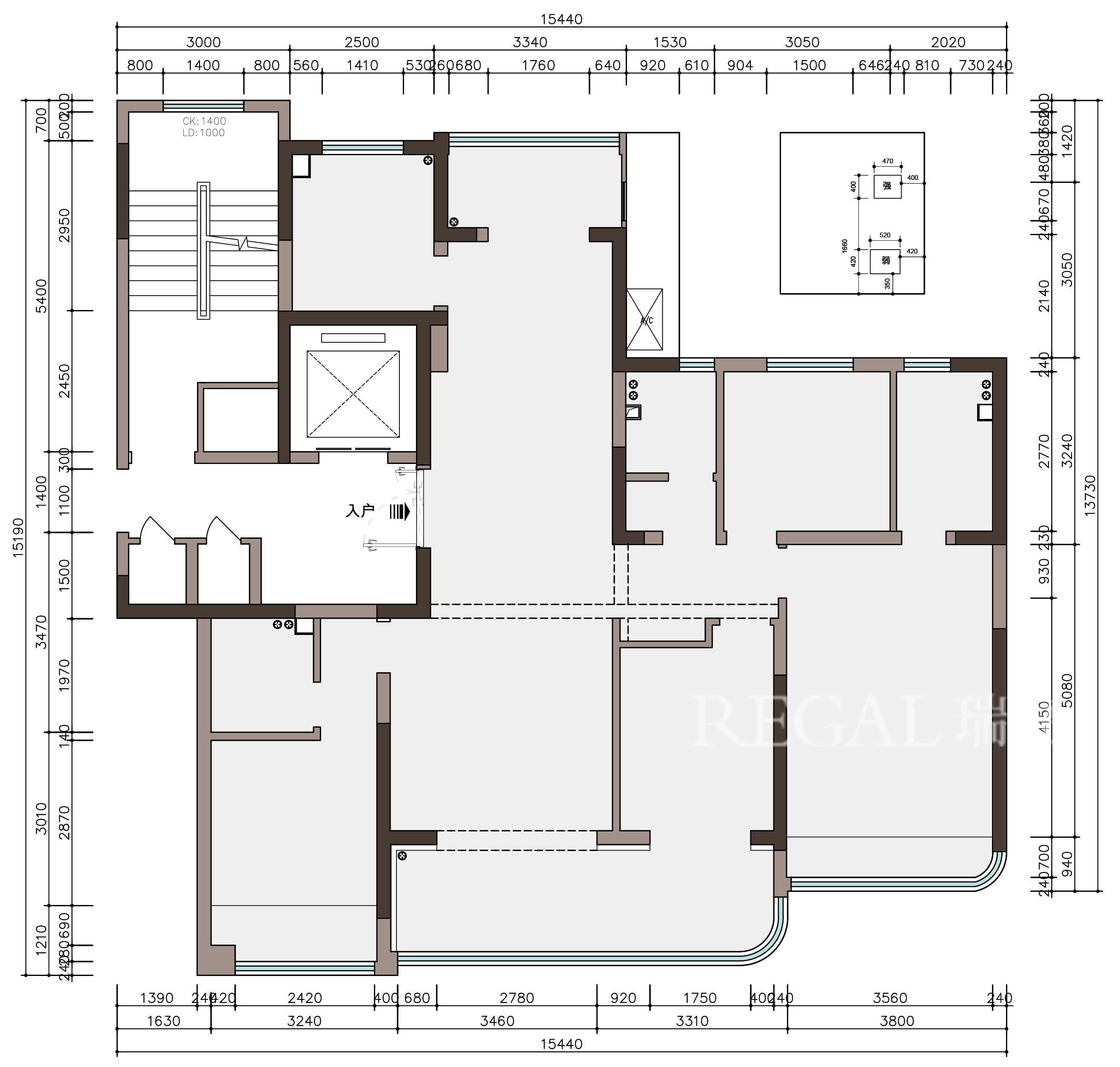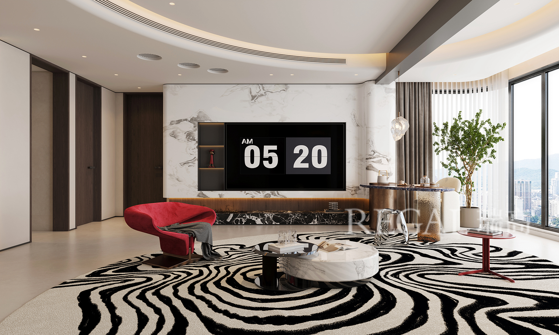 本案设计整体采用现代意识风格为设计思路。全房采用明装无主灯的形式设计营造柔和高级氛围。