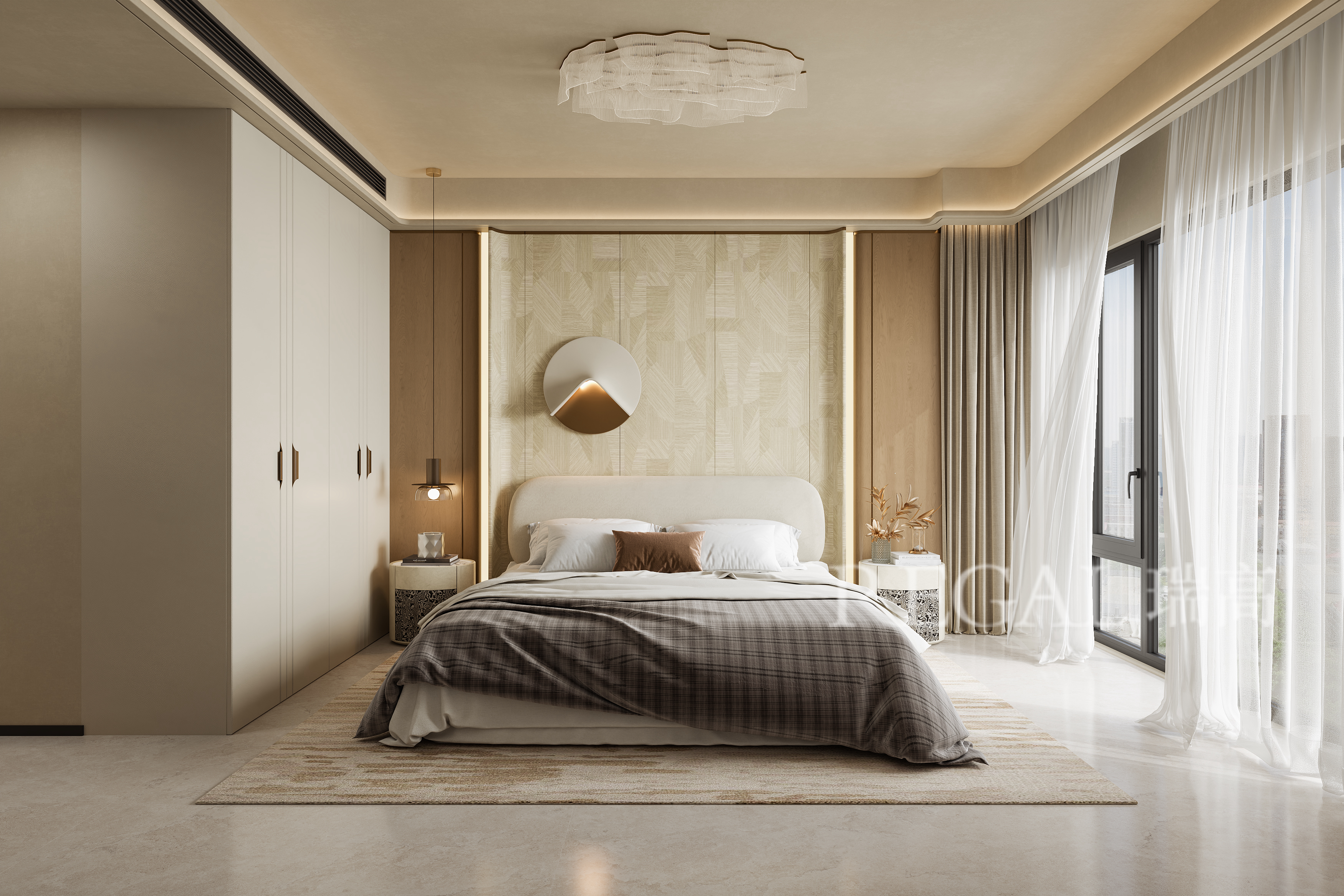 整个空间以米杏色 + 深胡桃木色为主色调,搭配柔和的无主灯光影,没有过度的装饰元素,用材质本身的质感传递高级感,营造出温暖、静谧又松弛的氛围,完美适配卧室 “疗愈休憩” 的核心功能。