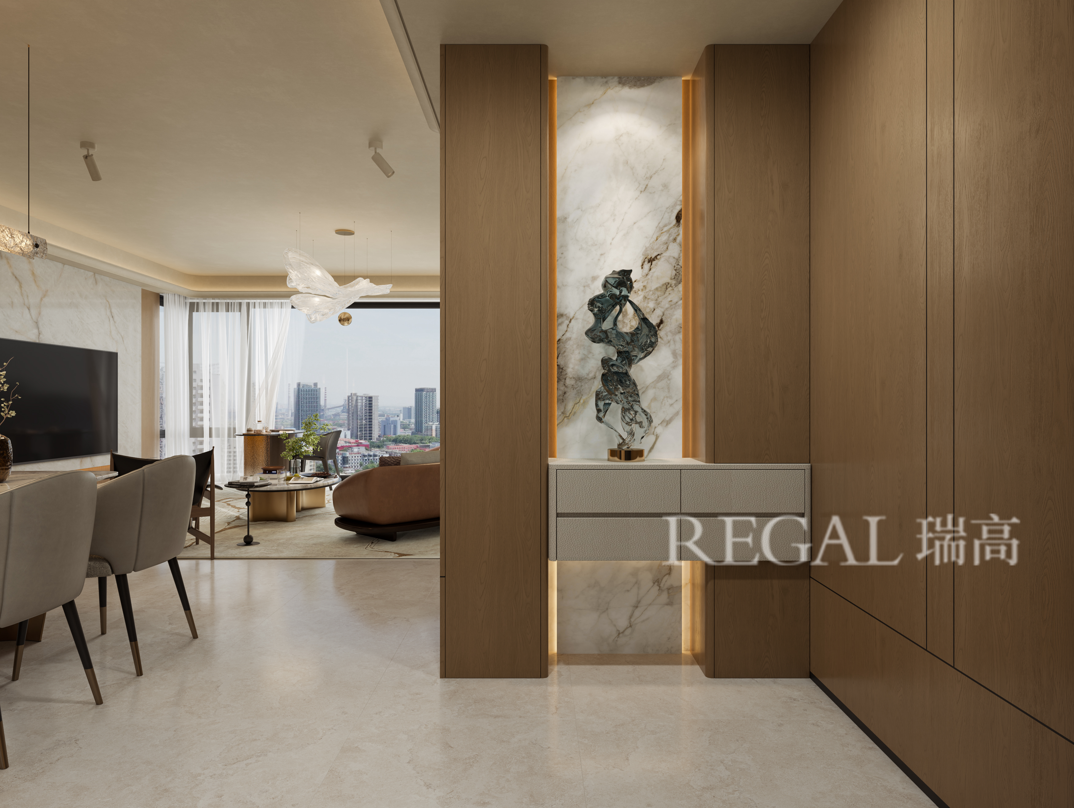 玄关作为入户的第一印象,被设计成了一个半围合式的过渡空间。左右两侧的木饰面立柱形成了天然的 “框景”,将视线自然引向中间的背景墙与端景,也起到了分隔玄关与客餐厅的作用,让入户有了明确的仪式感,避免了 “开门直见厅” 的直白感。