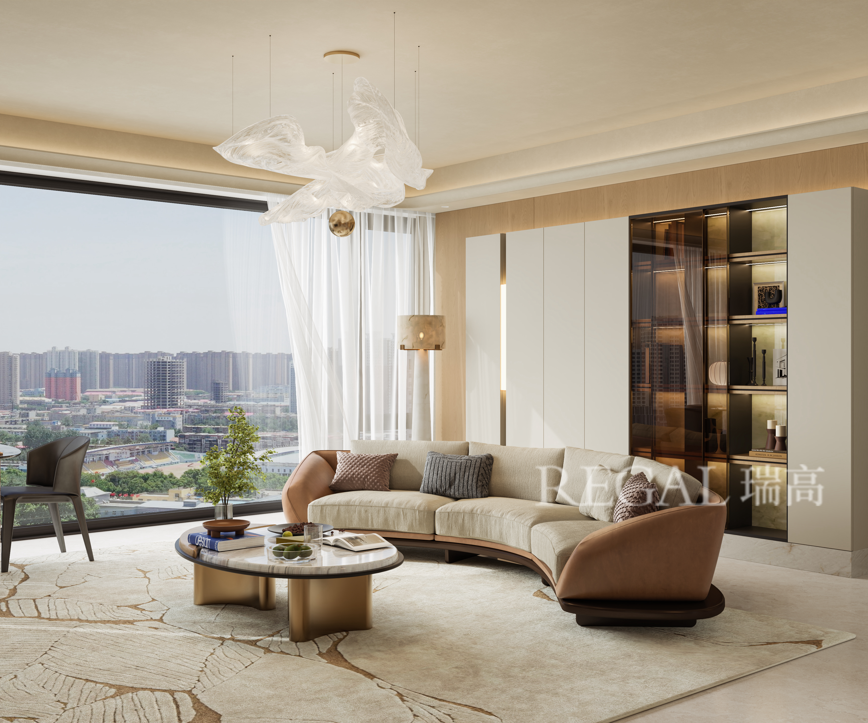 采光与视野:超大落地窗 + 柔纱帘,既引入充足自然采光,又柔化光线;同时能直接俯瞰城市景观,提升空间氛围感。