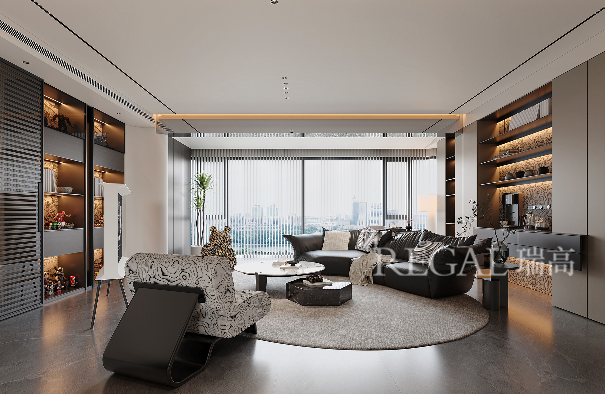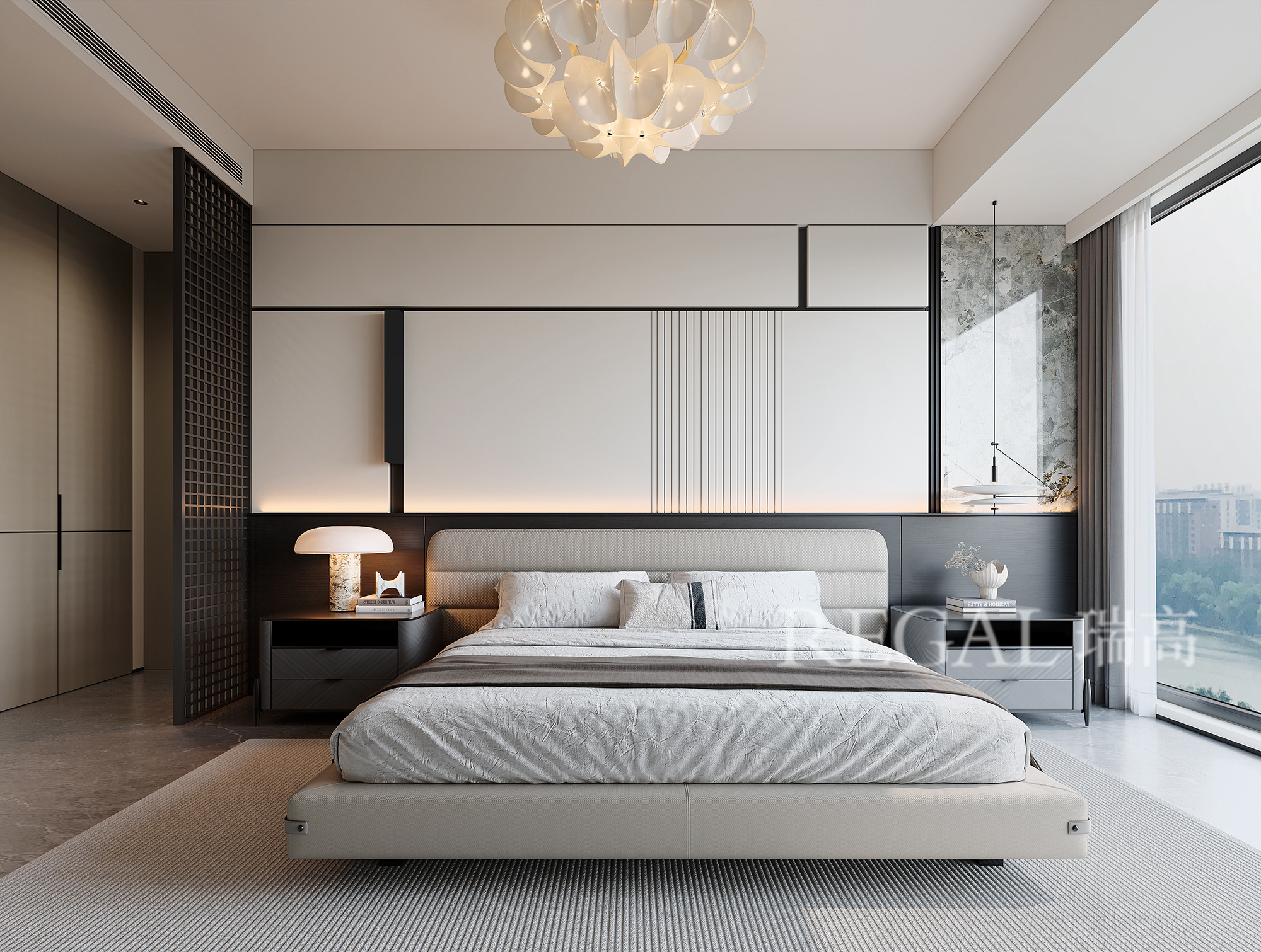 采光与视野:超大落地窗 + 柔纱帘,既引入充足自然采光,又柔化光线;同时能直接俯瞰城市景观,提升空间氛围感。