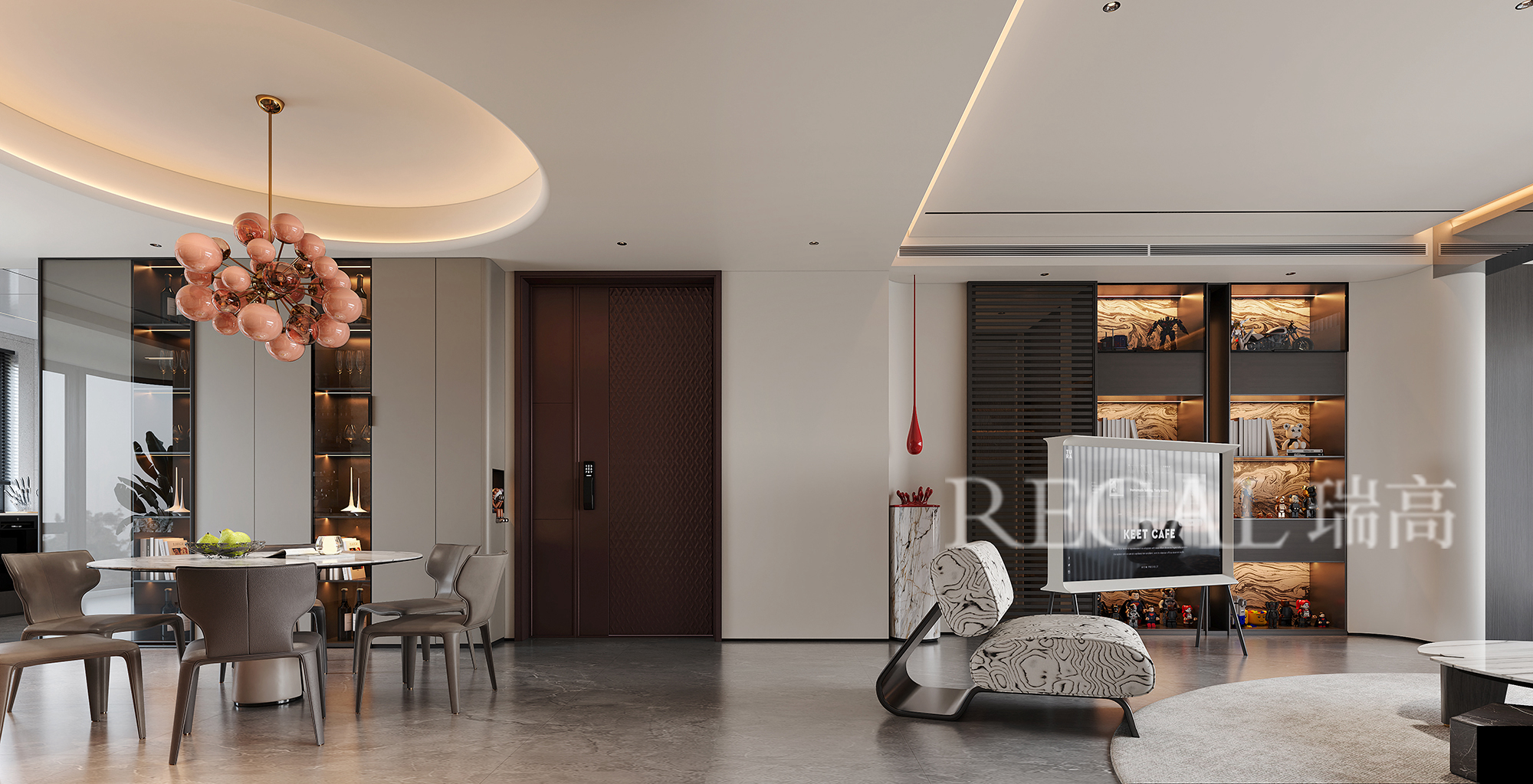 推门入户,就是精致的玄关,圆形吊顶与圆餐桌相互呼应,餐厅上方的粉色葡萄灯自由灵动。客厅和餐厅相通,增加了空间感与通透感。