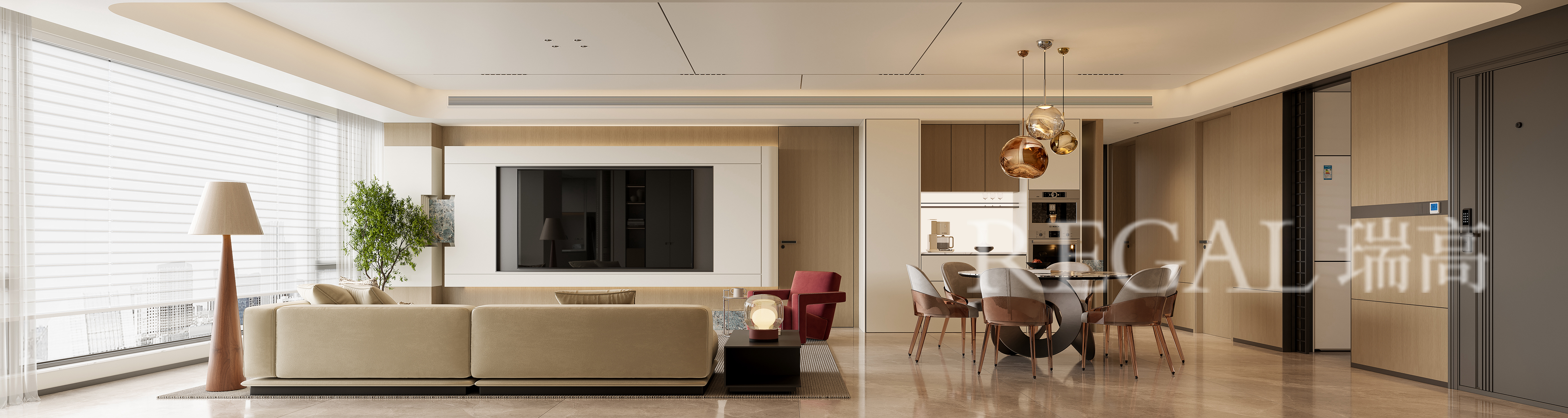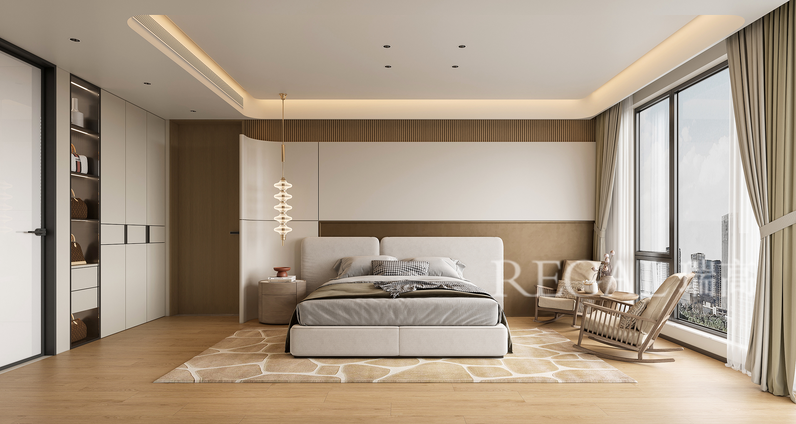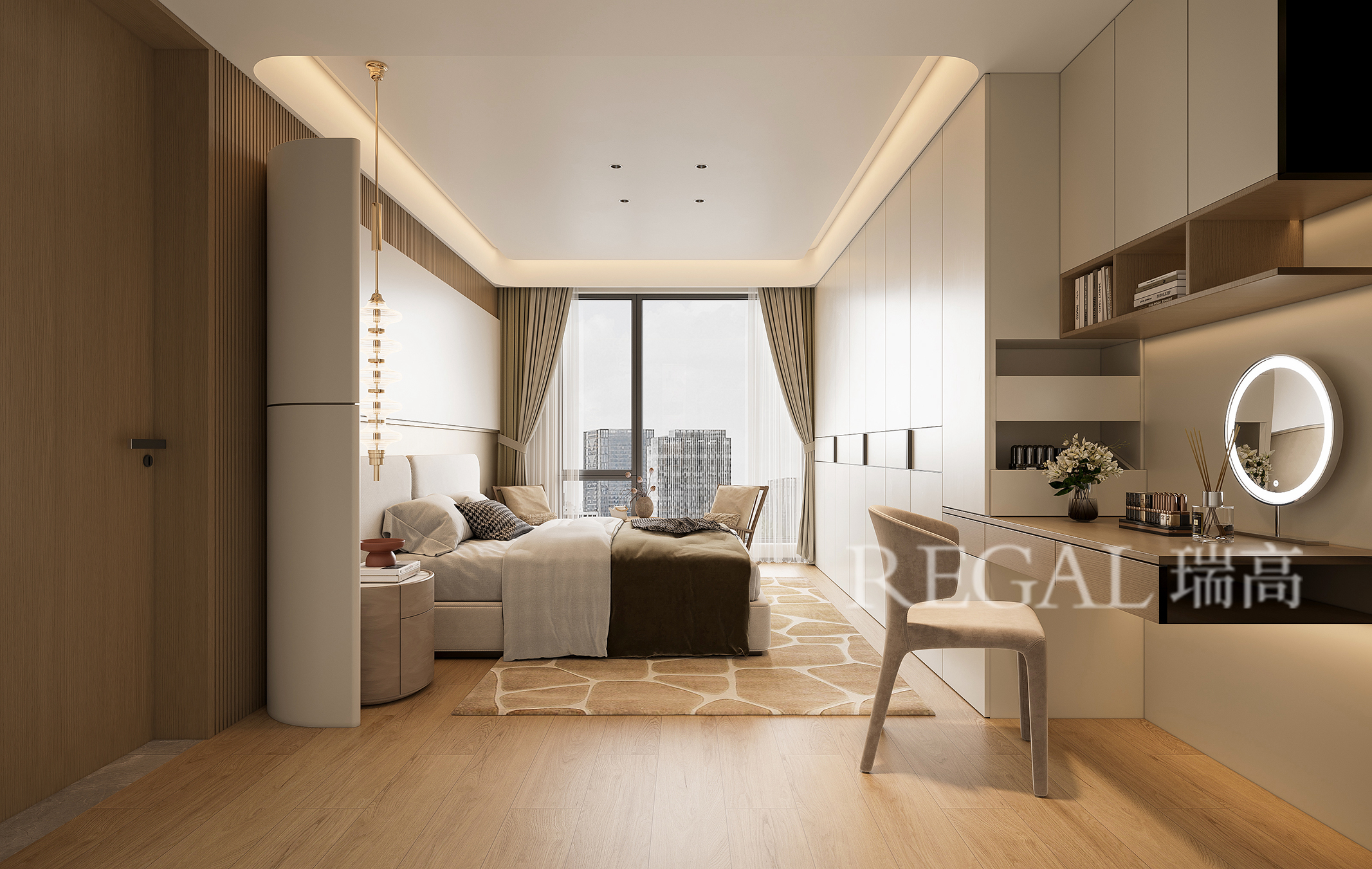 采光与视野:超大落地窗 + 柔纱帘,既引入充足自然采光,又柔化光线;同时能直接俯瞰城市景观,提升空间氛围感。