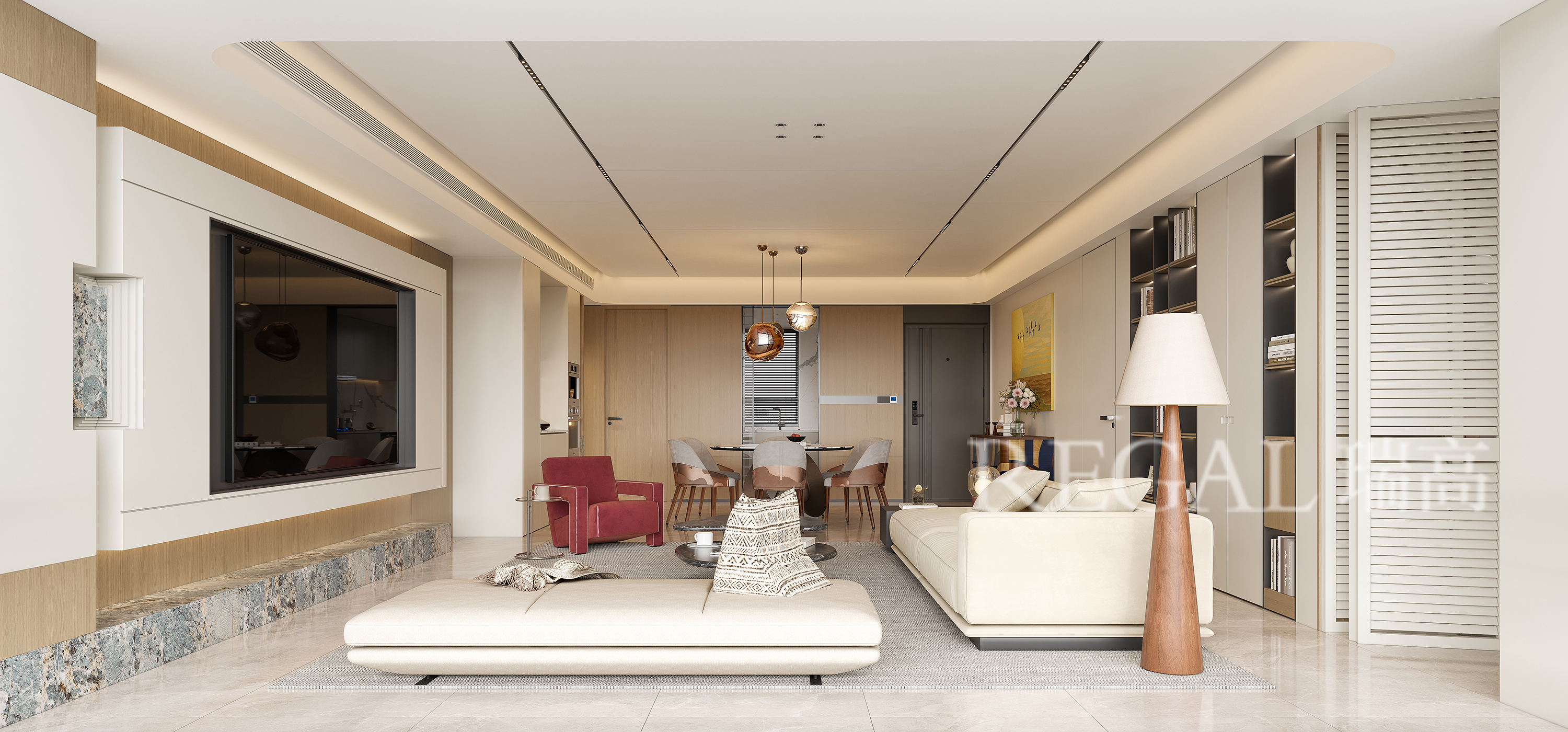 材质质感:暖棕木饰面 + 金属(茶几 / 吊灯 / 柜框)+ 光亮石材地面 + 局部大理石纹理,多重材质叠加出高级轻奢感。