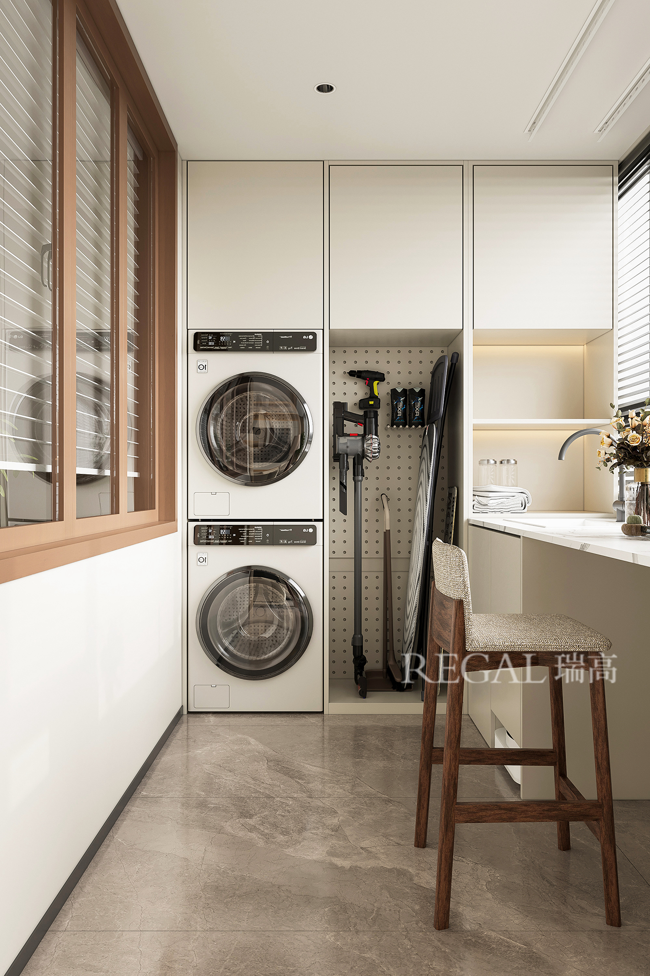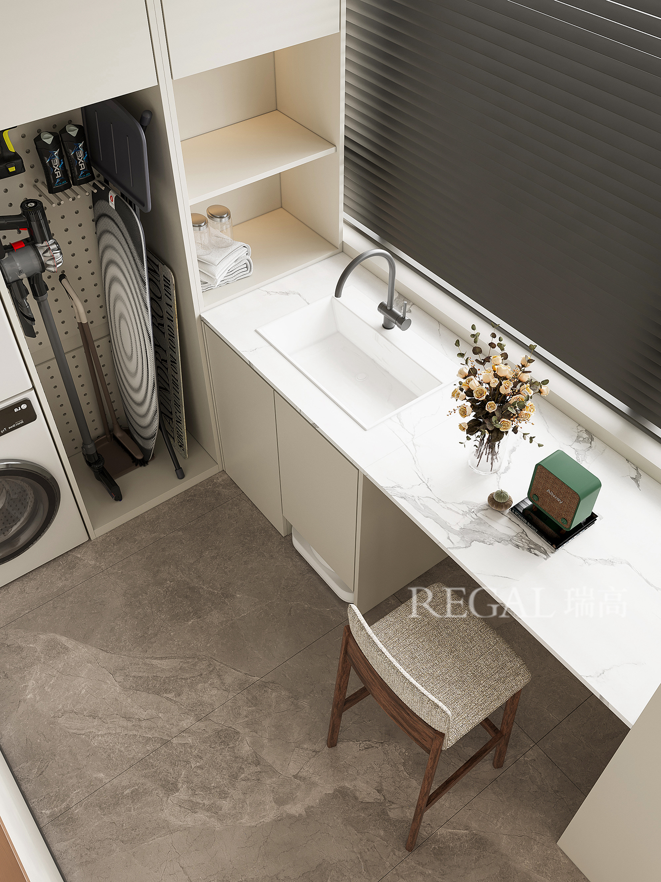 一个井井有条的家,藏着生活最本真的仪式感。家政间便是这样一处“秩序魔法空间”——洗衣、收纳、清洁等生活琐碎尽数收纳,让日常动线清晰高效,为家守住整洁底色。更妙的是,在此开辟一方男主人专属吧台,工作通话的专注、吞云吐雾的松弛皆能在此安放,琐碎家务与私享时光互不打扰,让平凡日子既有妥帖的烟火气,也有专属的松弛微光。