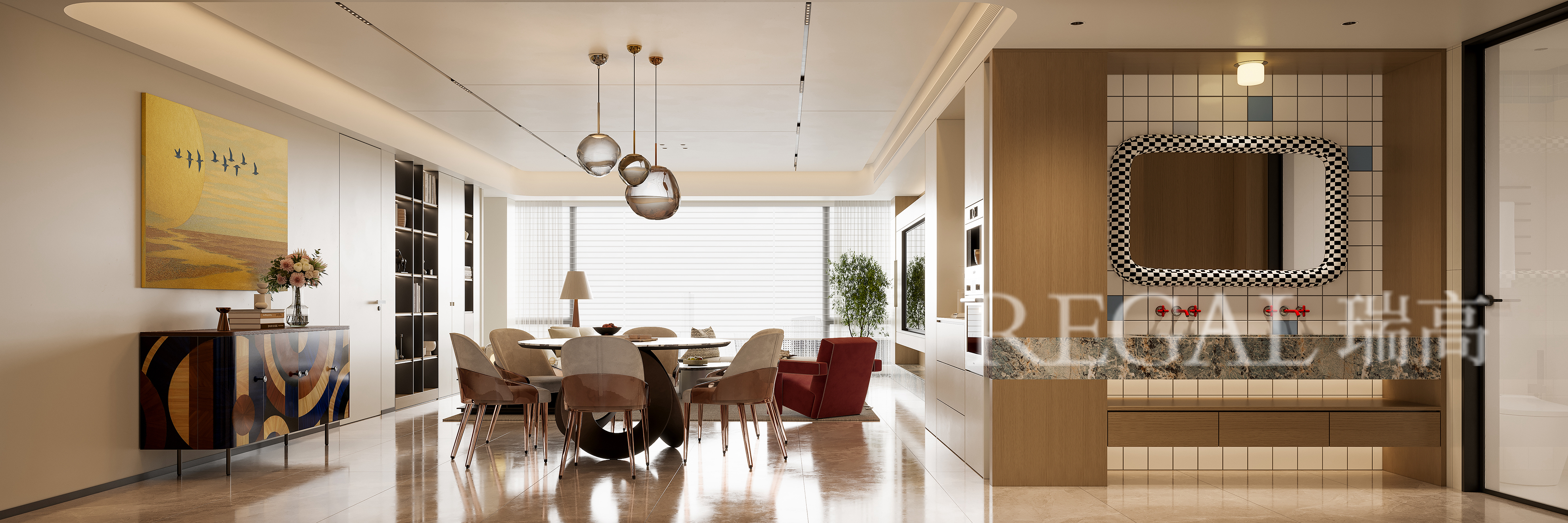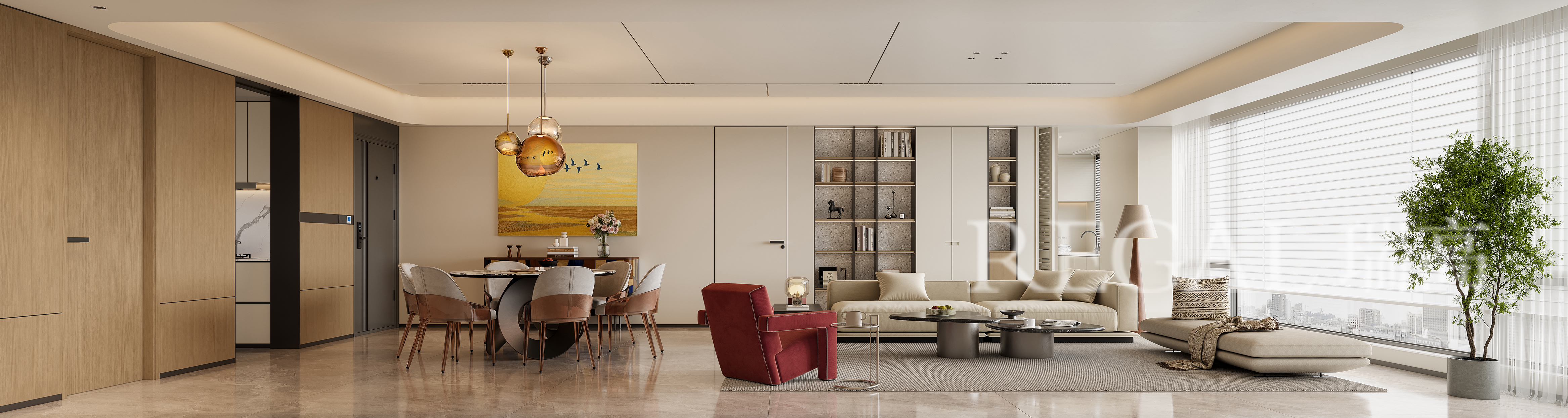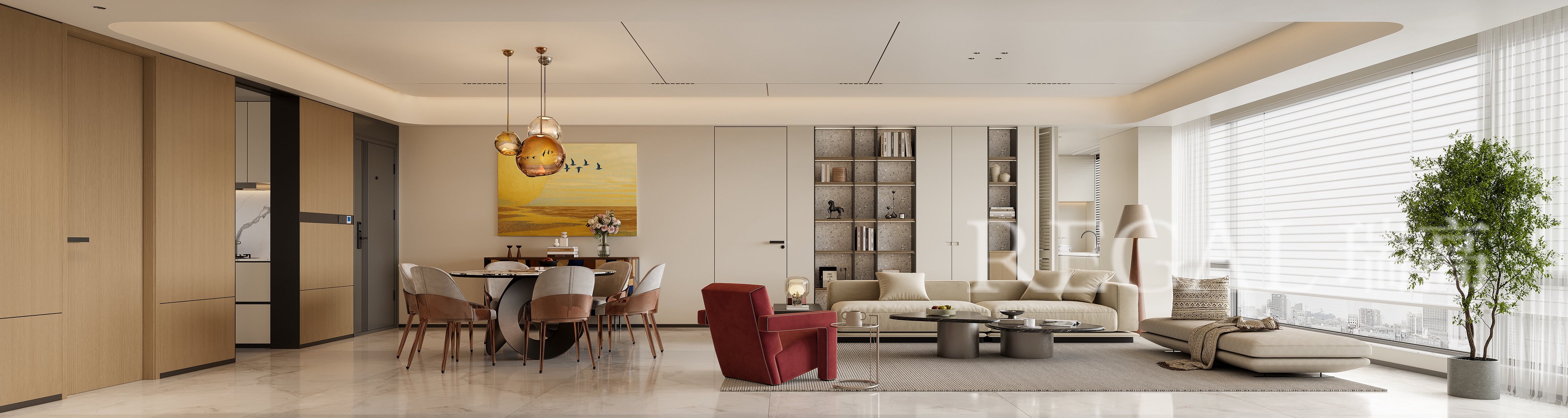 空间布局:客餐一体化开放式设计,消弭区域隔断,让空间通透感、开阔感翻倍。