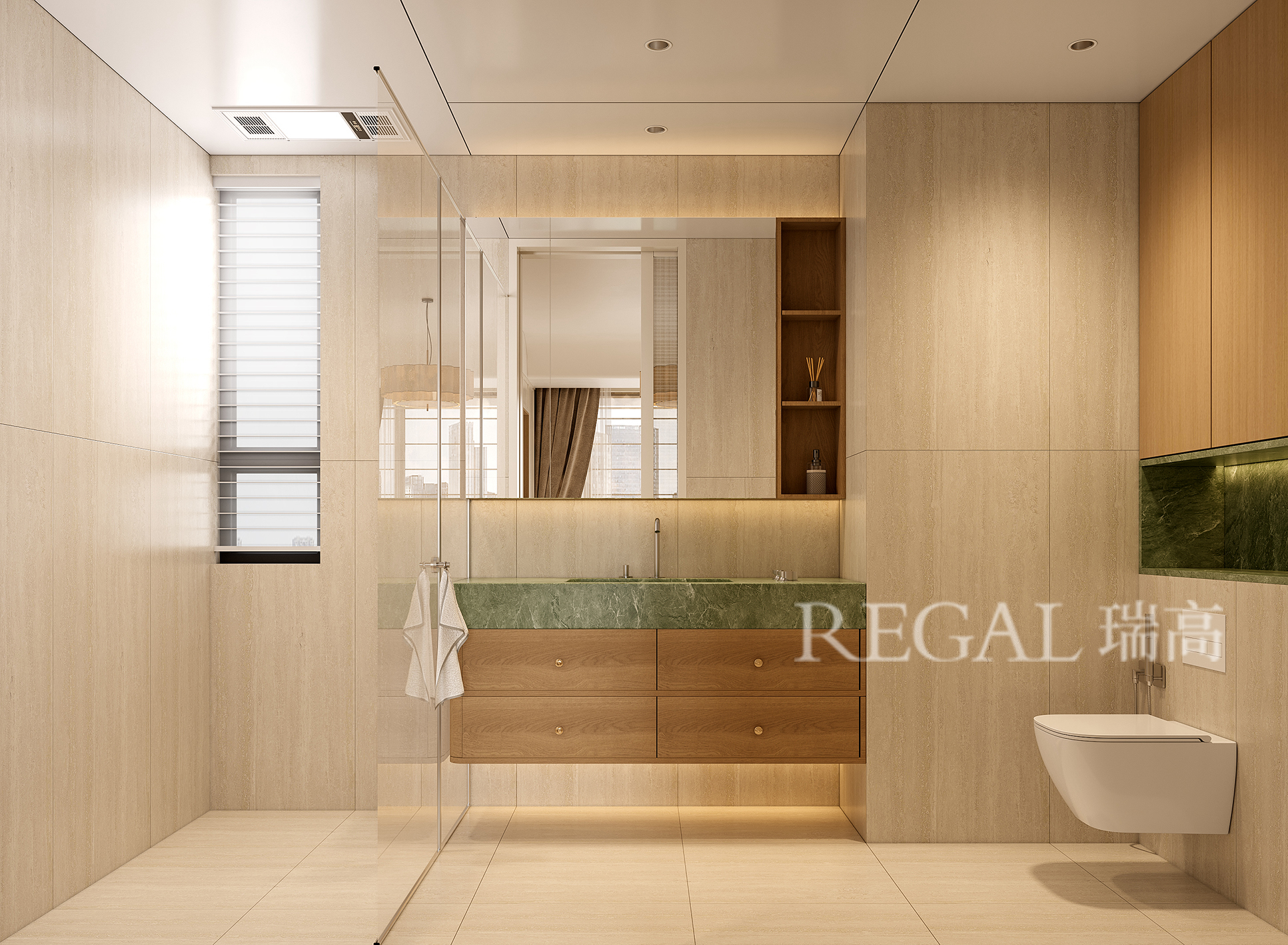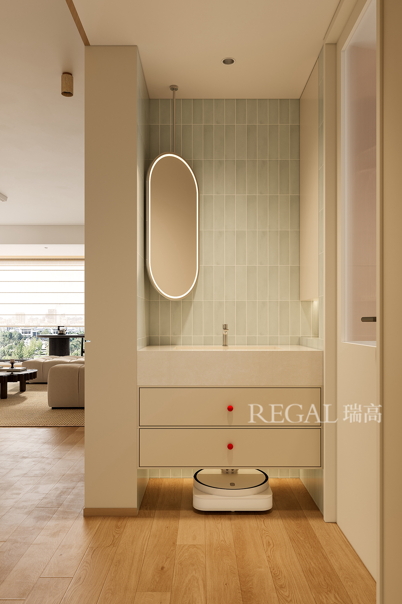 整个空间以奶杏色 + 浅橡木色 + 淡薄荷绿为核心配色,没有刺眼的冷色调,整体温润柔和: 墙面和柜体是低饱和的奶杏色,搭配浅橡木色地板,自带暖调滤镜; 背景墙的淡薄荷绿竖条砖,用清新的浅色调打破了大面积暖木色的沉闷,又不会跳脱,像给空间加了一层 “柔光滤镜”。